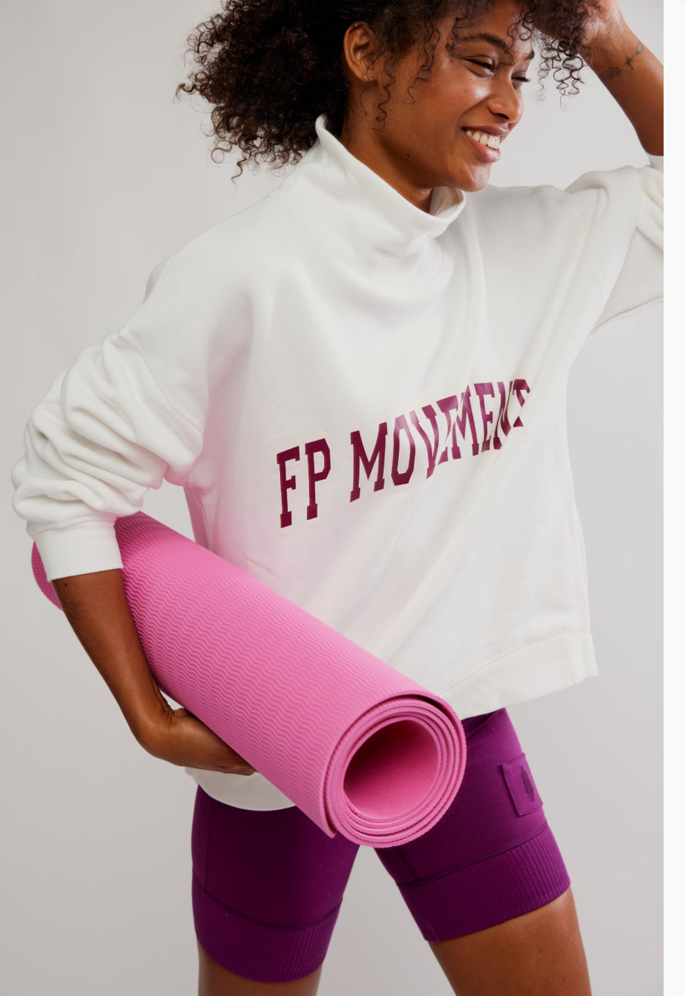 Features: Pullover; Funnel neckline, dropped shoulder seams, collegiate FP Movement logo at the front; Shorts: Pull-on design, ribbed trimming, mid-thigh length, stretch fit