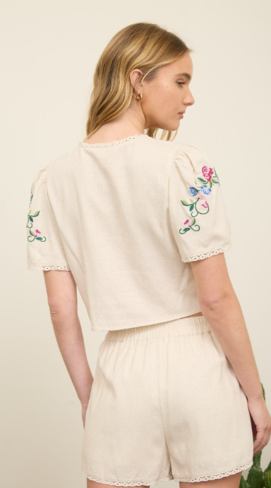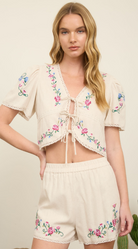 The cropped blouse features delicate floral embroidery that adds texture and artisanal detail, while the adjustable front tie closure creates a flattering, customizable fit. Light and breezy, it pairs perfectly with the coordinating high-waisted shorts for a balanced silhouette that feels playful yet put-together.