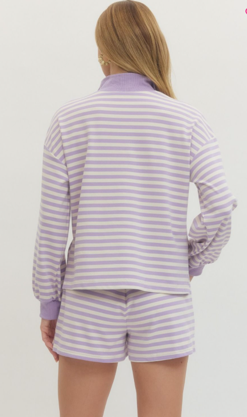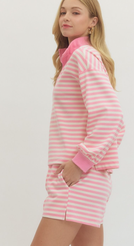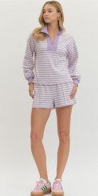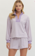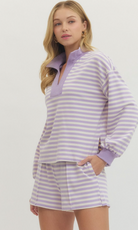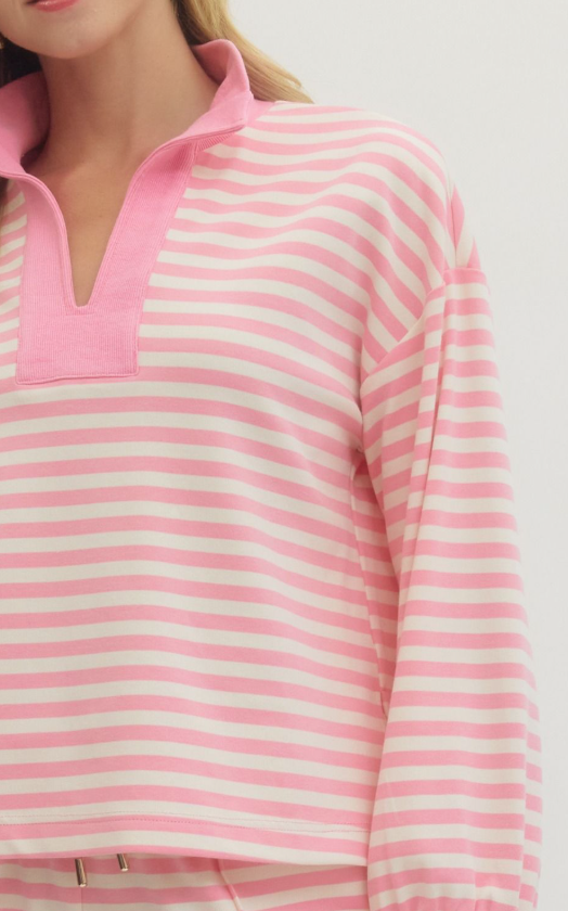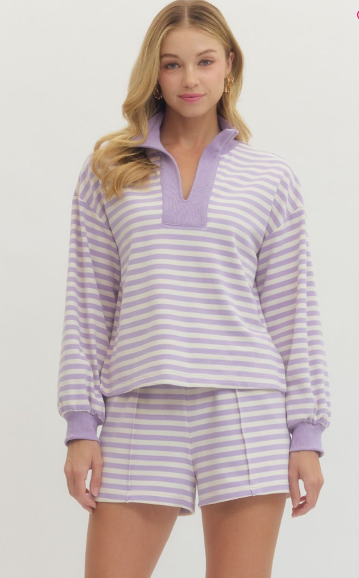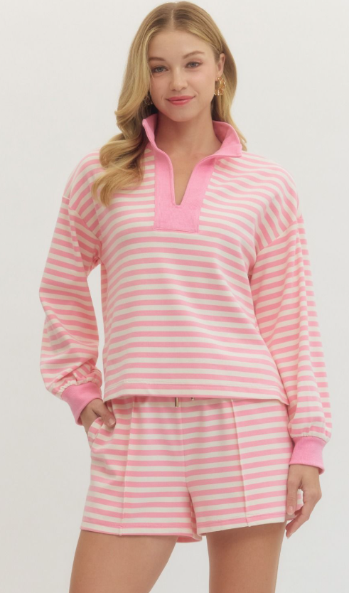 Effortlessly polished and perfectly coordinated, this striped knit set features a long sleeve top with a contrast split V-neck collar and ribbed cuffs for a clean, elevated look. Paired with matching bottoms designed for all-day comfort, the set offers a cohesive silhouette that feels both relaxed and refined.