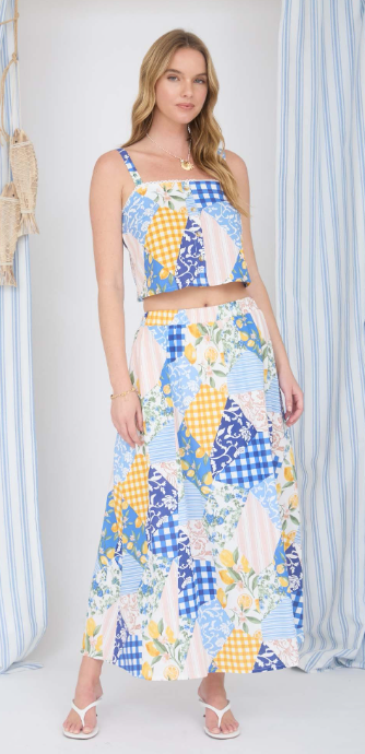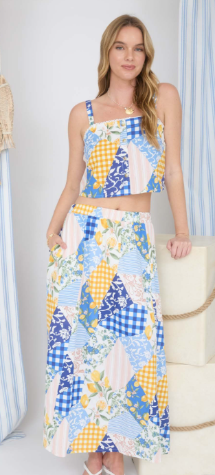 Playful, artistic, and effortlessly cool — this patchwork linen blend crop top is a true statement piece. Designed with a flattering square neckline and sleeveless silhouette, it offers a structured yet easygoing look perfect for warm-weather styling.
