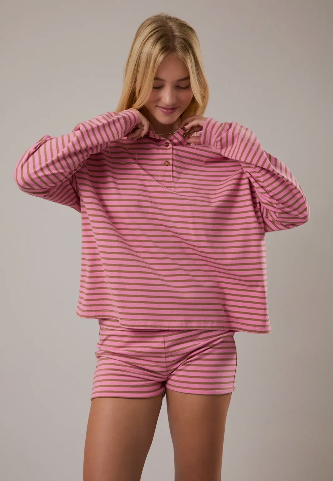 This long sleeve, round-neck oversized top pairs perfectly with its matching low-rise shorts, featuring a flattering striped fold-over waistband for that effortless, lived-in look. The soft pink and brown stripe combo adds a fun pop of color while still feeling neutral and wearable.