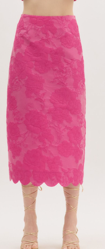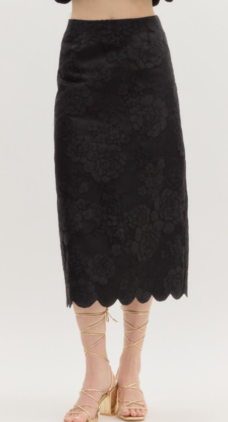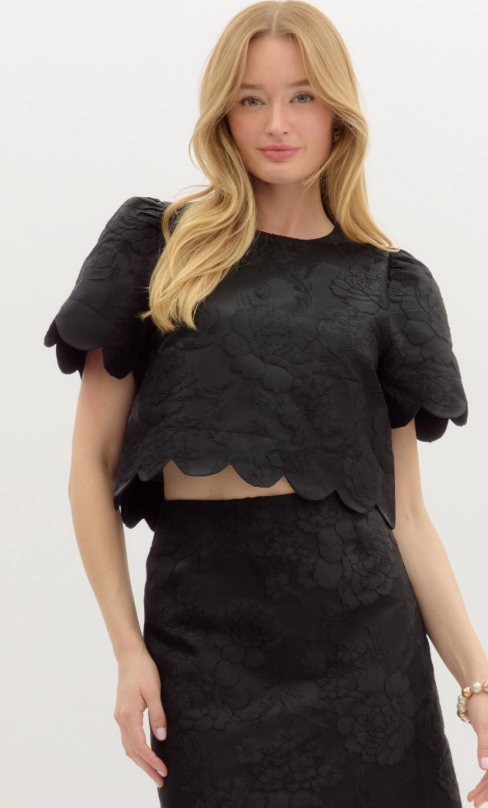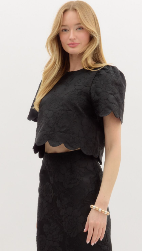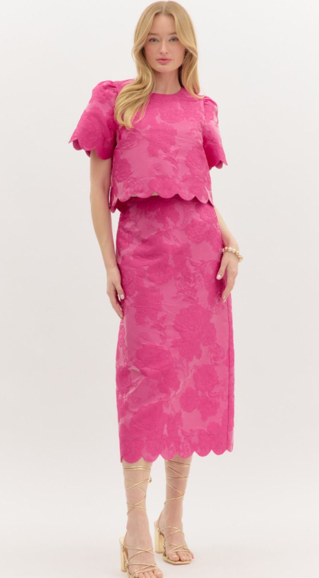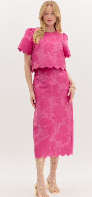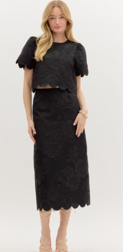 Make a statement with this elegant two-piece set, crafted from solid floral jacquard fabric for a beautifully textured, structured look. The top features clean lines and a flattering fit, finished with a delicate scallop hem that adds a soft, feminine touch. Paired with a coordinating midi skirt, the set offers timeless sophistication with modern appeal. Both pieces are designed in a lightweight, woven material that’s unlined, non-sheer, and breathable for all-day comfort. A back zipper closure ensures a sleek fit from every angle—perfect for weddings, brunches, or elevated everyday style.