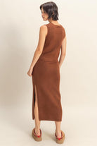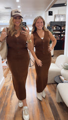 This chic two-piece set is fall perfection. Featuring a functional button-down sweater vest in rich chocolate brown, paired with a matching fitted skirt that flatters your shape with its stretchy, body-forming knit. A subtle side slit adds just the right touch of movement and edge. Designed in the dreamiest shade of chocolate, this set is versatile enough to wear layered with boots and a trench for crisp fall days, or dressed up with heels for a night out.