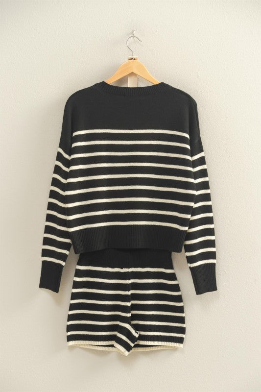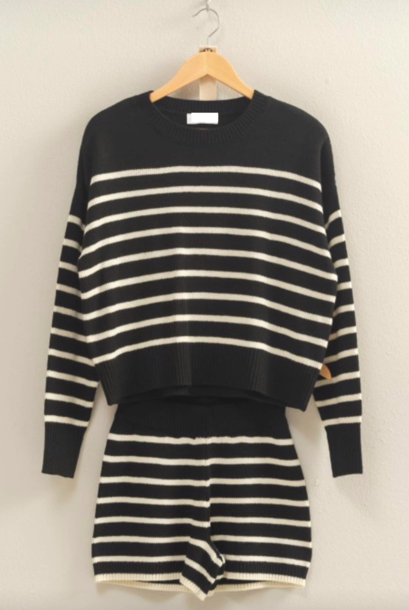 This striped knit sweater set is a cozy-meets-chic staple you’ll live in all season. The long-sleeve sweater top is soft, lightweight, and easy to wear, while the matching shorts give it that effortless, lounge-to-street vibe. Available in two classic combos—green with cream stripes or black with cream stripes—it’s the perfect set for looking put-together without even trying. Pair with sneakers for casual days or dress it up with boots and a denim jacket for fall layering.