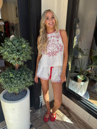 This embroidered detail set is the perfect warm-weather staple for spring and vacation dressing. Designed with intricate embroidery that adds texture and artisanal charm, the matching top and bottom create an effortless, put-together look. Lightweight and breathable, the fabric keeps you comfortable in sun-soaked destinations while maintaining a polished feel. Whether styled together for an easy statement outfit or worn separately, this set transitions seamlessly from daytime exploring to relaxed evenings.