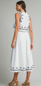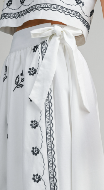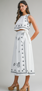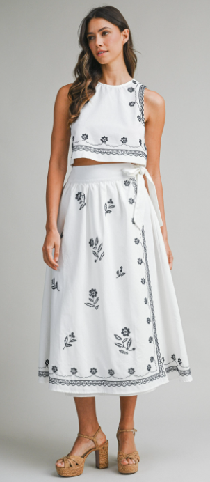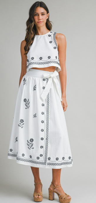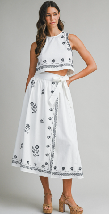 This effortlessly chic two-piece set features a sleeveless crop top and a matching wrap-style midi skirt, crafted from a breathable linen-blend fabric with delicate embroidery throughout. The crop top offers a clean, minimal silhouette that balances beautifully with the skirt’s relaxed drape.