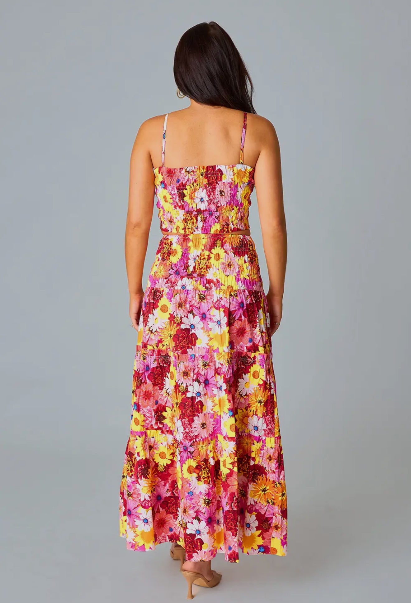 This new set will have you booking your next vacation! The Wildflower Set features a fully smocked cropped tank top with adjustable straps. The skirt features a smocked waist and tiers. Her comfortable fit and bold design make her the perfect combination for your next favorite outfit!