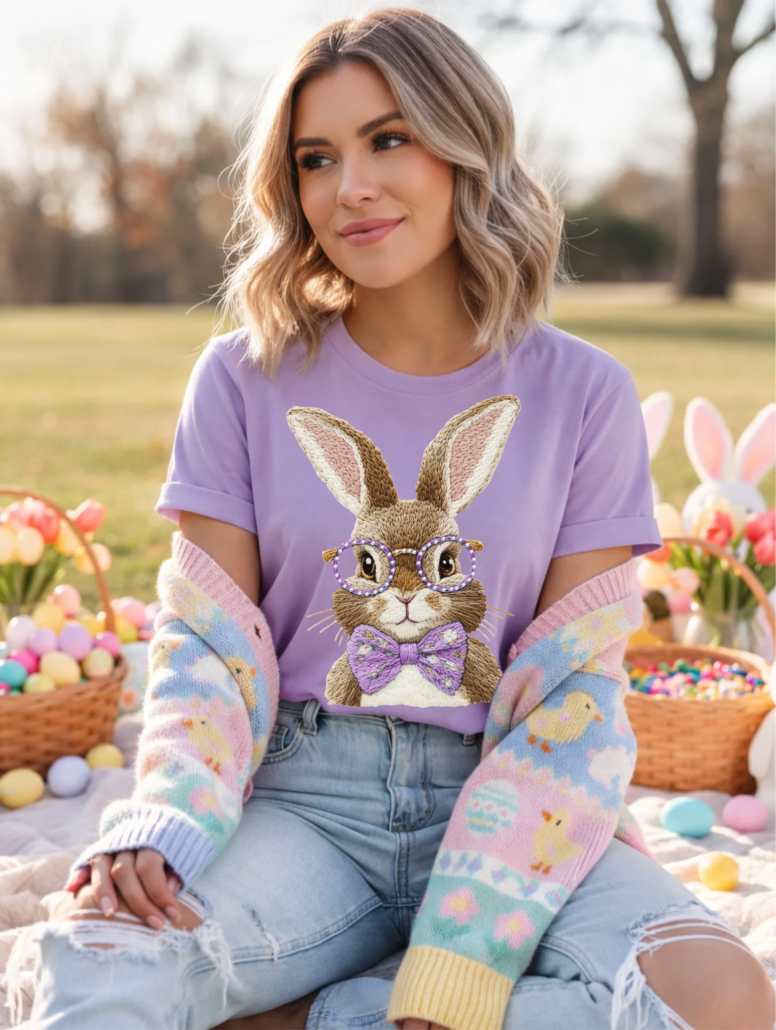 Easy to style with your favorite denim, skirts, or lounge shorts, this tee is perfect for egg hunts, spring outings, or simply adding a touch of bunny-approved glam to your day. Cute, cozy, and just a little quirky — exactly what every Easter outfit needs.
