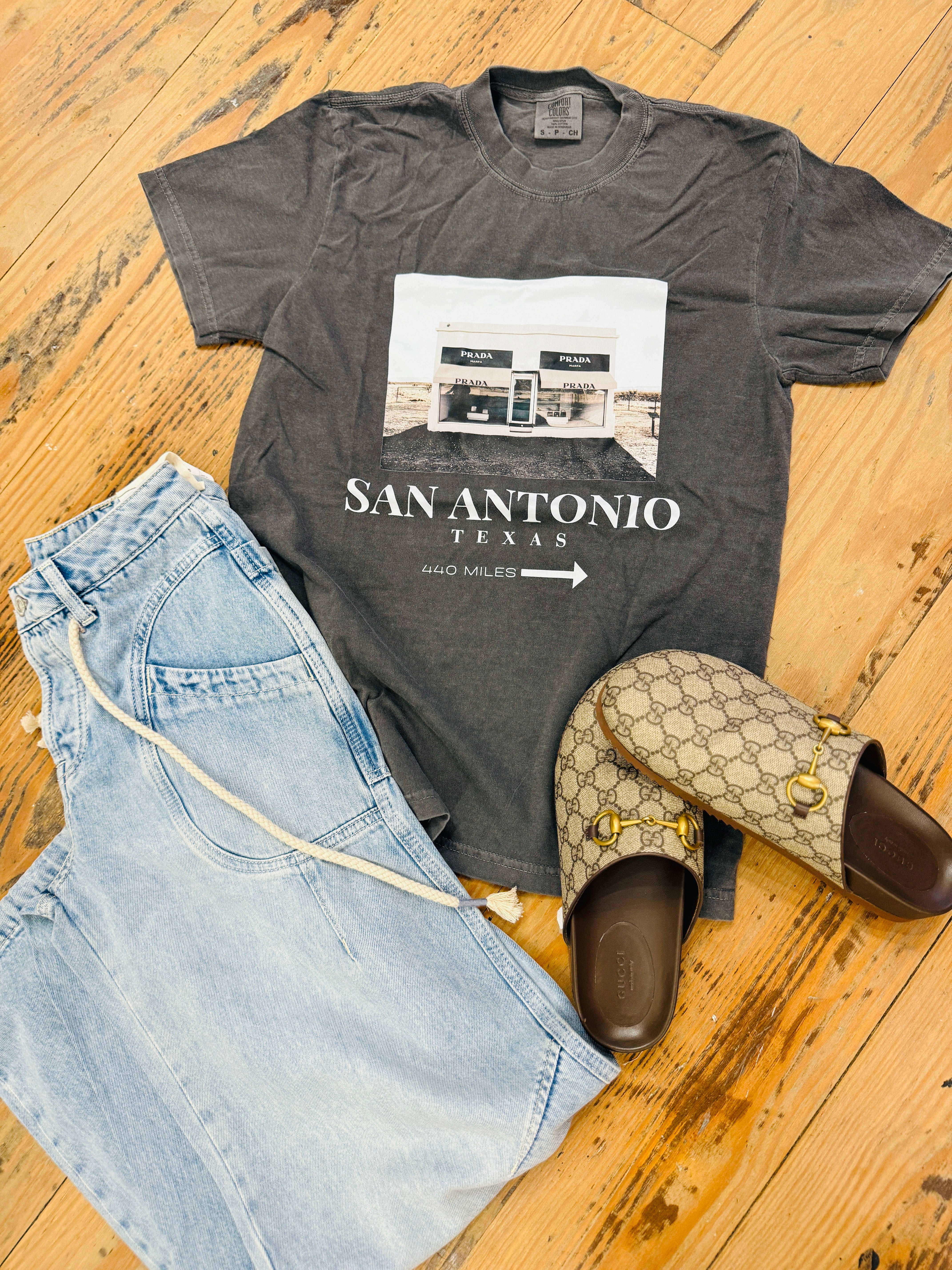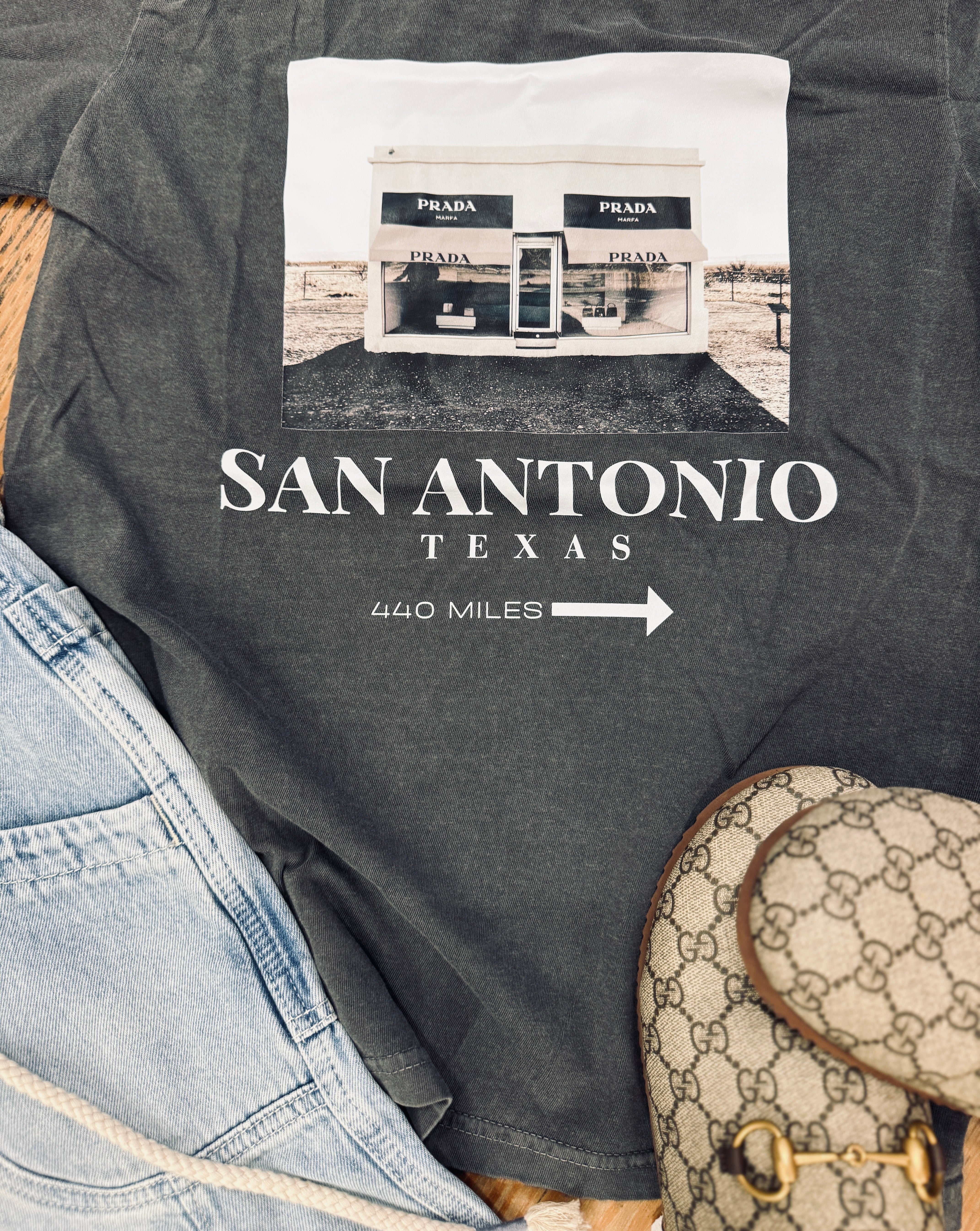 A fun, laid-back graphic tee that feels personal and cool. This dark washed gray T-shirt features a charming photo of the Prada store captured in Marfa, paired with playful typography that reads “San Antonio, Texas — 440 miles.” It’s the perfect mix of nostalgic travel vibes and everyday style.