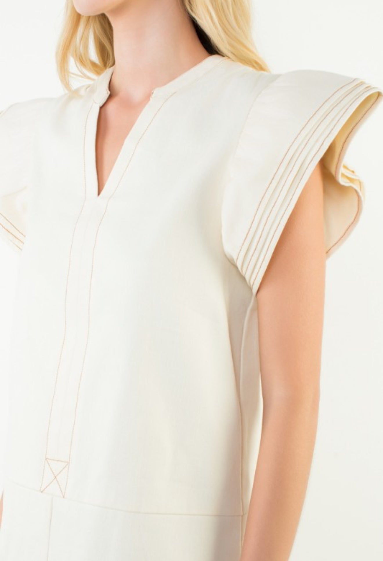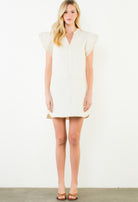 A timeless ivory mini dress featuring soft flutter sleeves and a flattering V-neckline, crafted in classic THML style. Lightweight and effortlessly feminine, this easy silhouette moves beautifully and transitions from day to night with ease. Simple, chic, and perfect for any occasion where you want to feel polished and pretty.