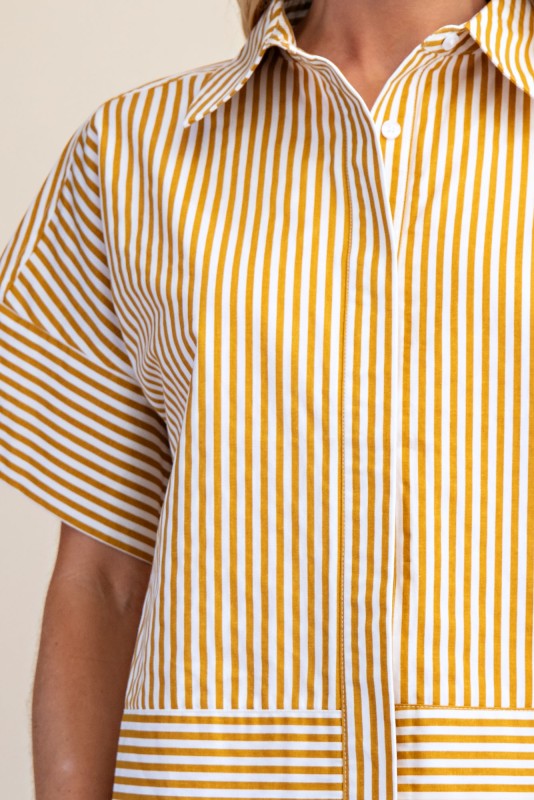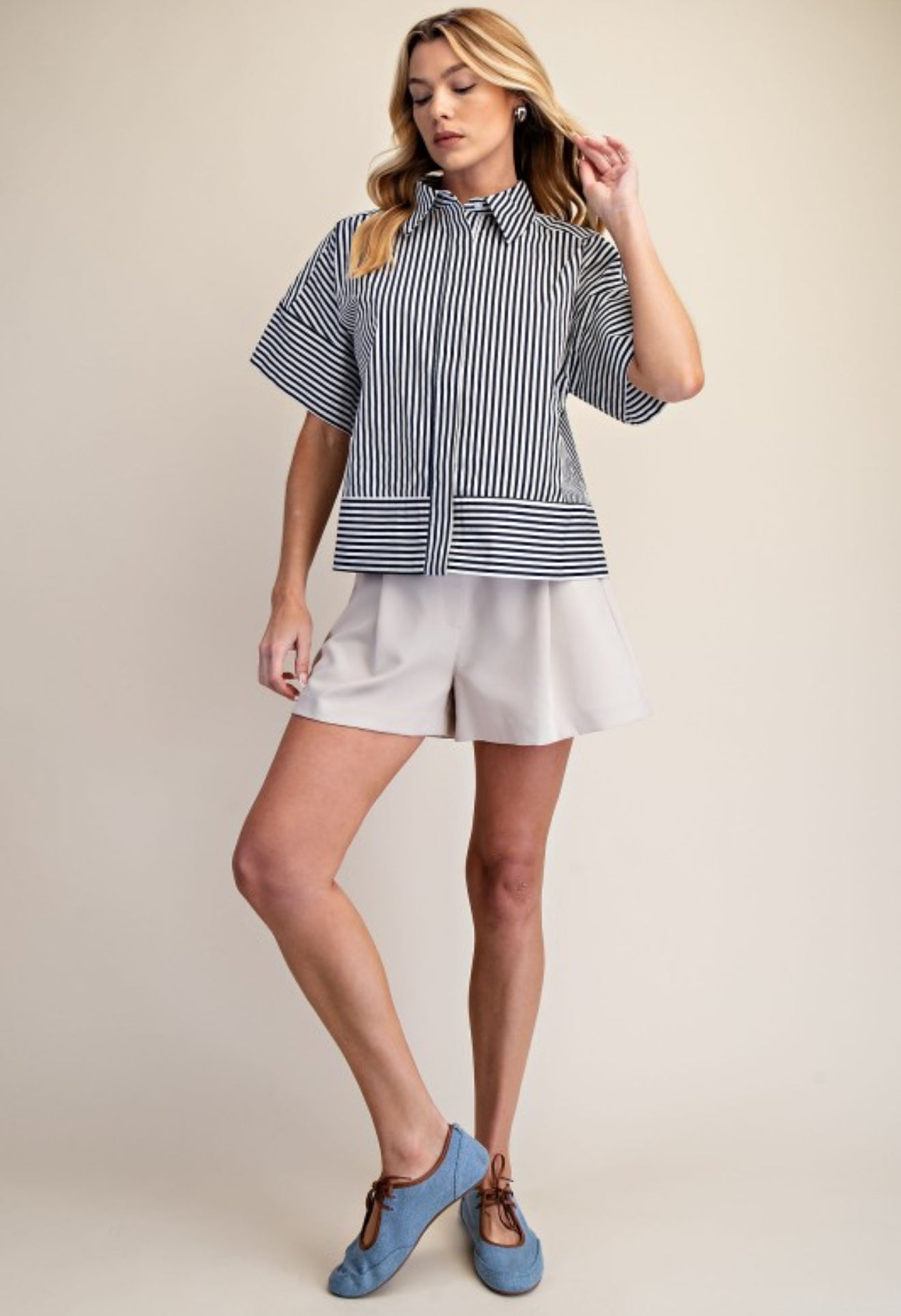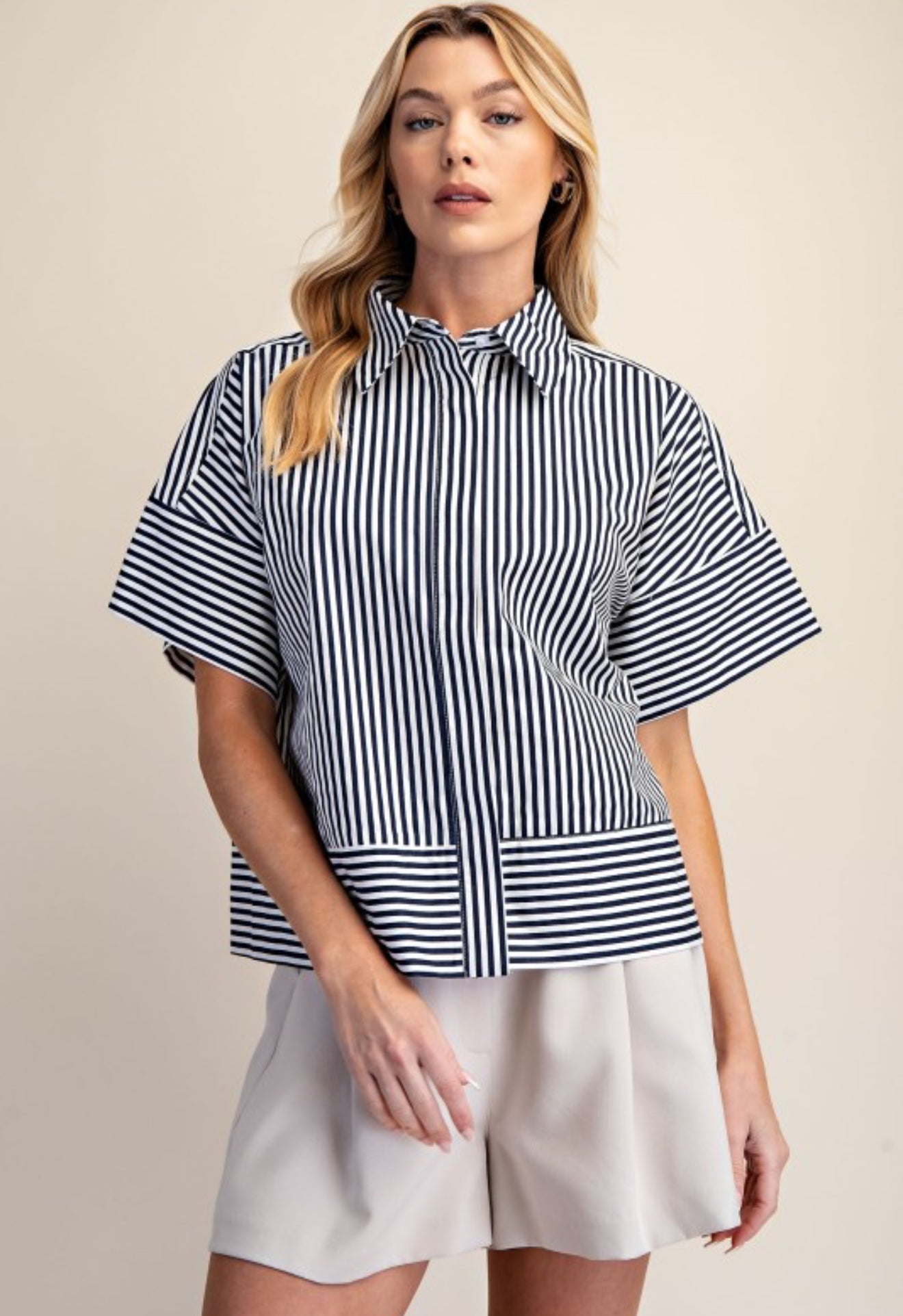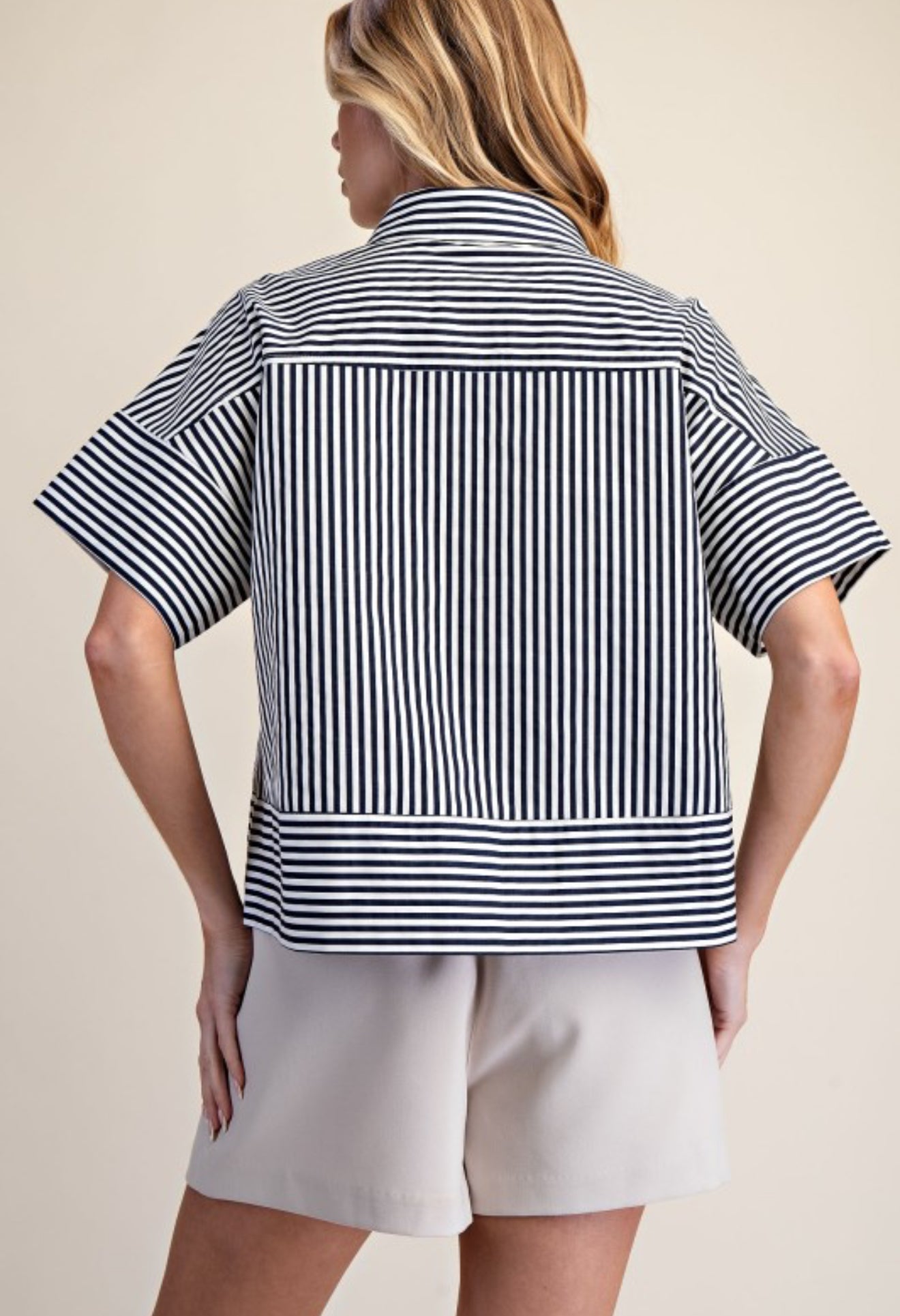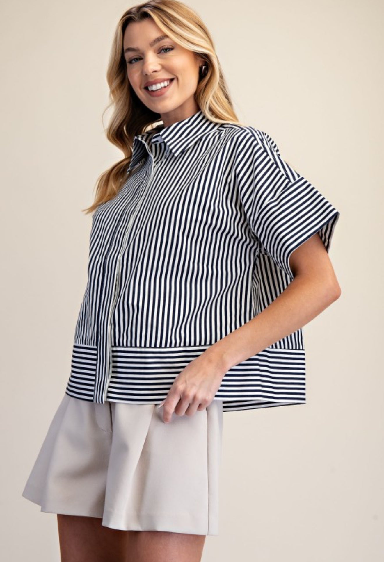 Classic with a fresh, polished feel 💙 This navy striped button-down top features a clean neckband collar and short sleeves for an effortlessly refined look. The crisp stripes add timeless appeal, while the lightweight fabric keeps it comfortable and easy to wear. Perfect for workdays, weekends, or layering year-round—this is a go-to staple that brings effortless style to any outfit.