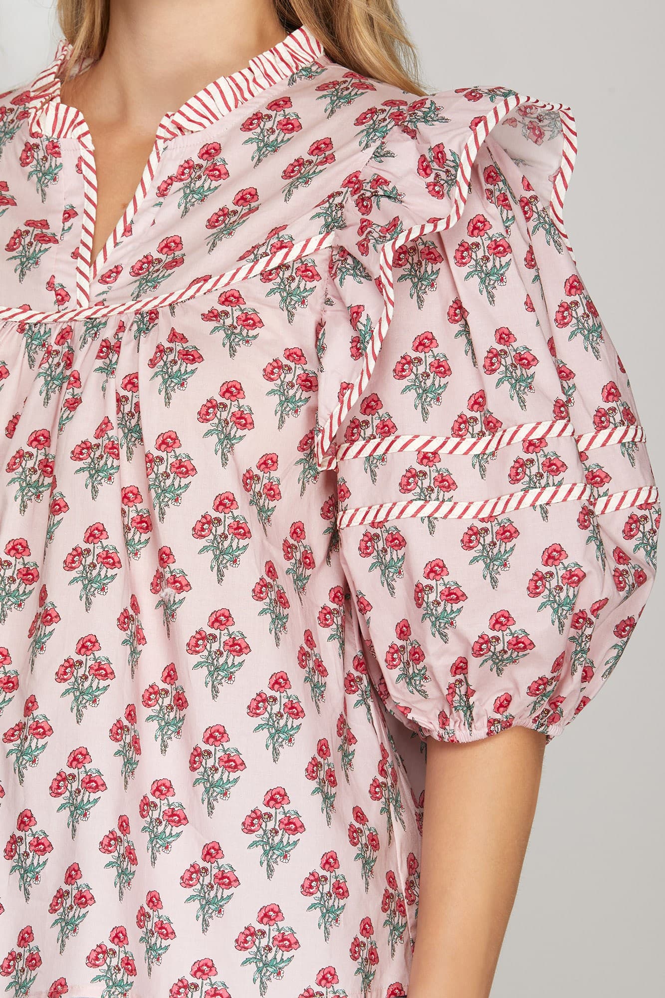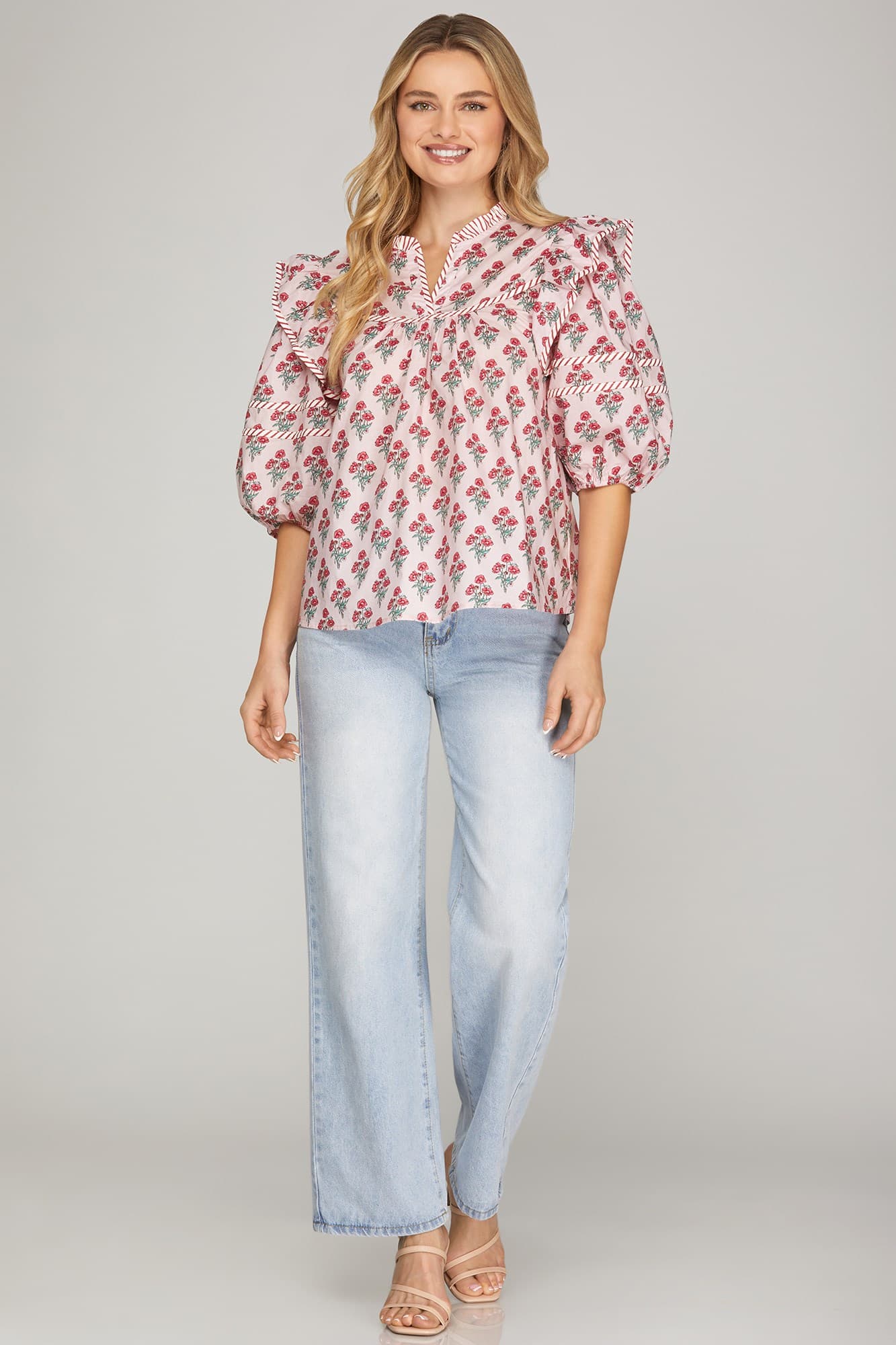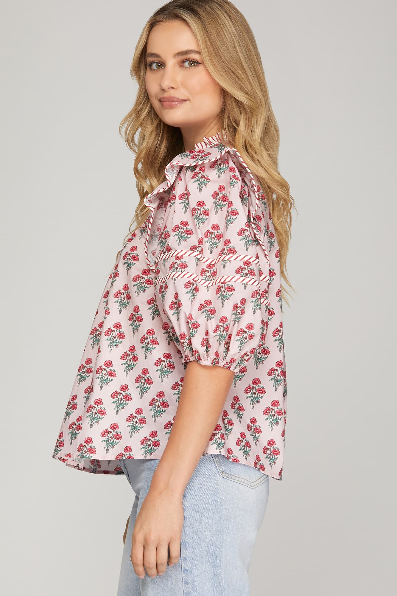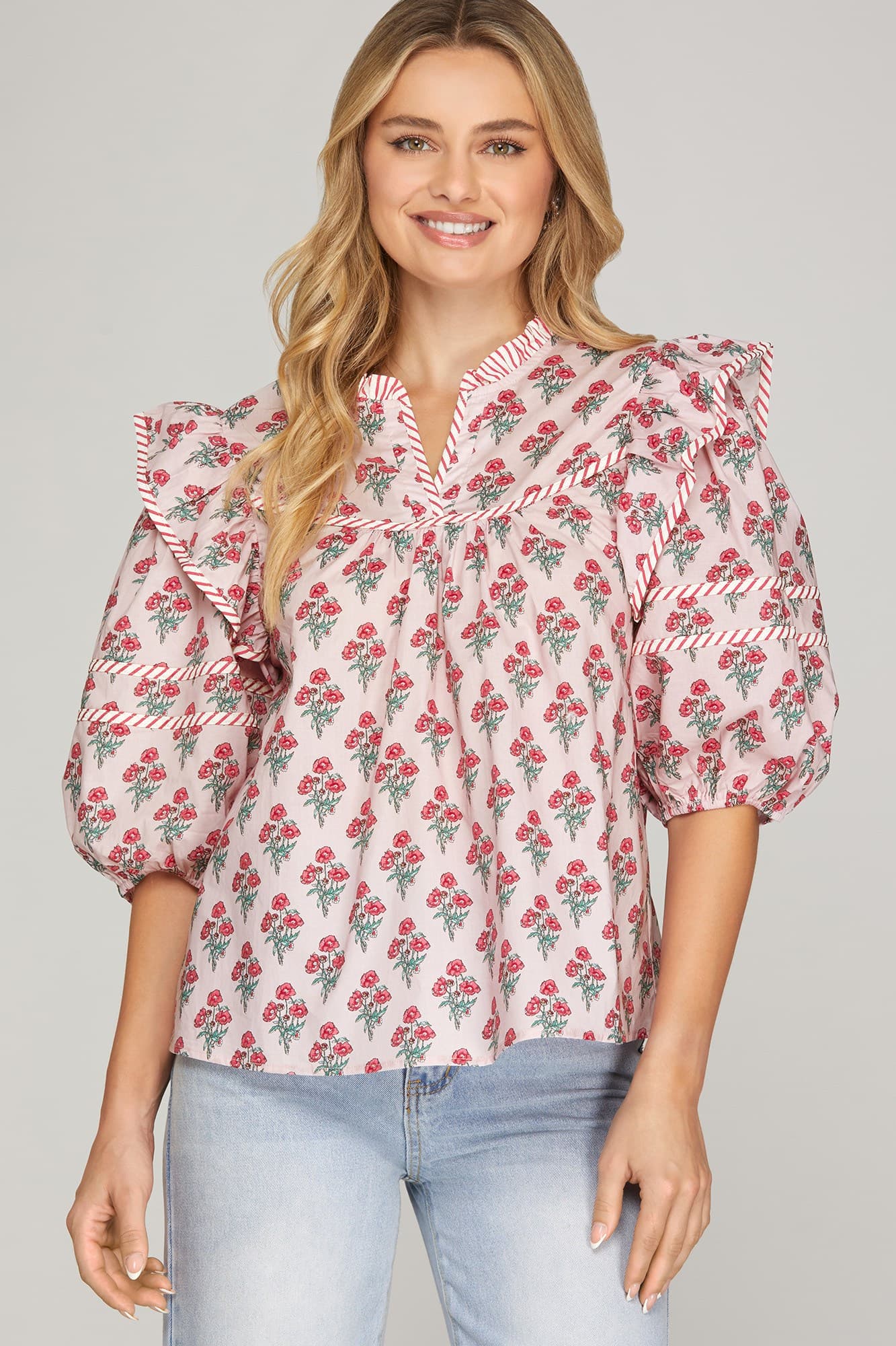 This pretty woven top is all about the details. Featuring soft puff half sleeves, a delicate floral print, and eye-catching contrast trim, it’s the perfect mix of feminine and elevated. Easy to dress up or down, this top pairs beautifully with denim, trousers, or a flowy skirt.