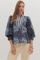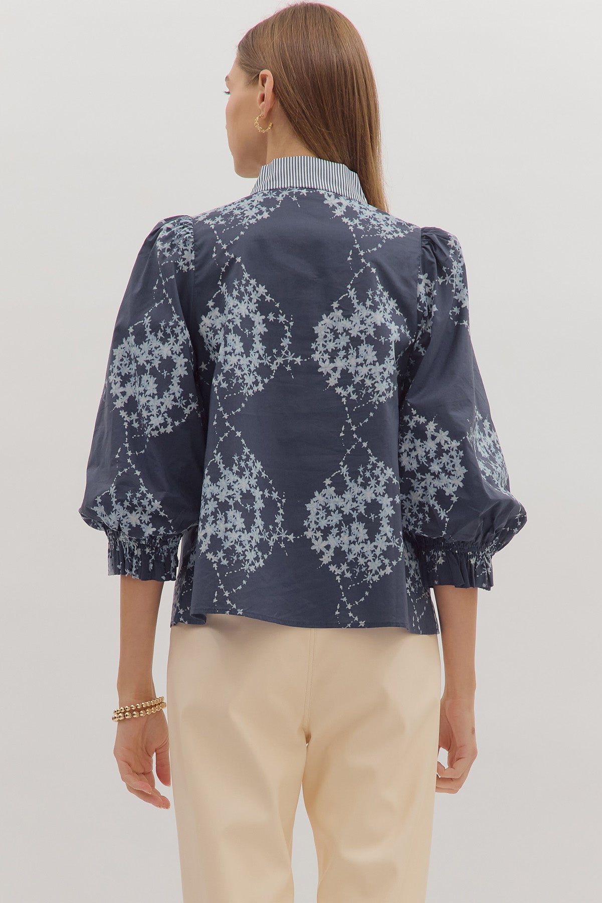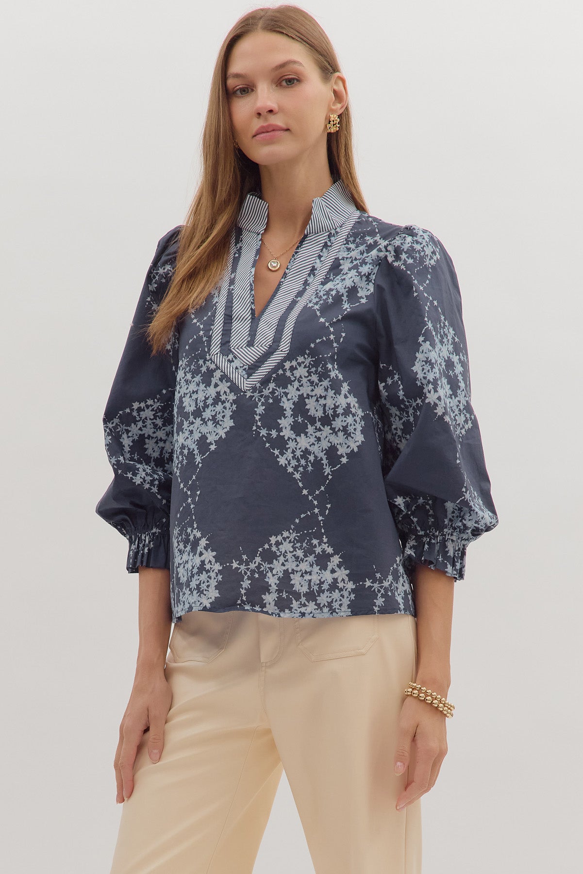A chic navy three-quarter sleeve top that plays with contrast and detail. The color-blocking design is elevated by a subtle tone-on-tone floral pattern in shades of blue, giving it a fresh, modern twist. The floral print adds texture without being overpowering, making it easy to style up or down.