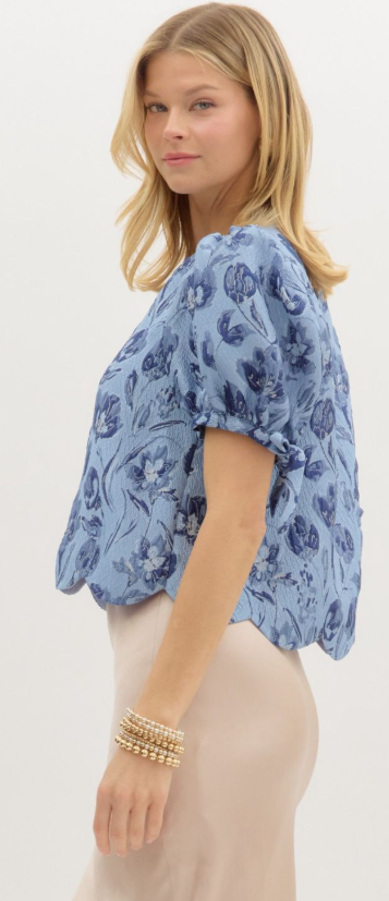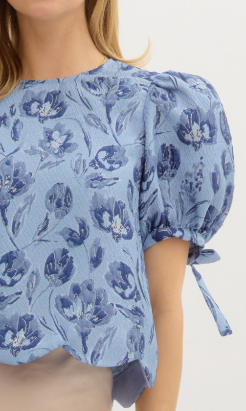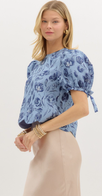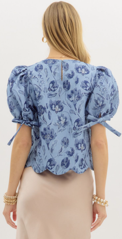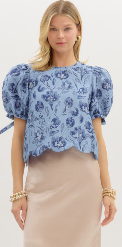 Feminine and refined, this floral jacquard pullover top is a standout piece with delicate texture and thoughtful details. Designed with short puff sleeves and sweet tie closures, it brings a playful touch to a timeless silhouette. A single button keyhole closure at the back adds elegance, while the scallop hem offers a soft, romantic finish. Crafted from lightweight, woven fabric, this unlined, non-sheer top is perfect for pairing with skirts, denim, or tailored shorts for a polished yet effortless look.