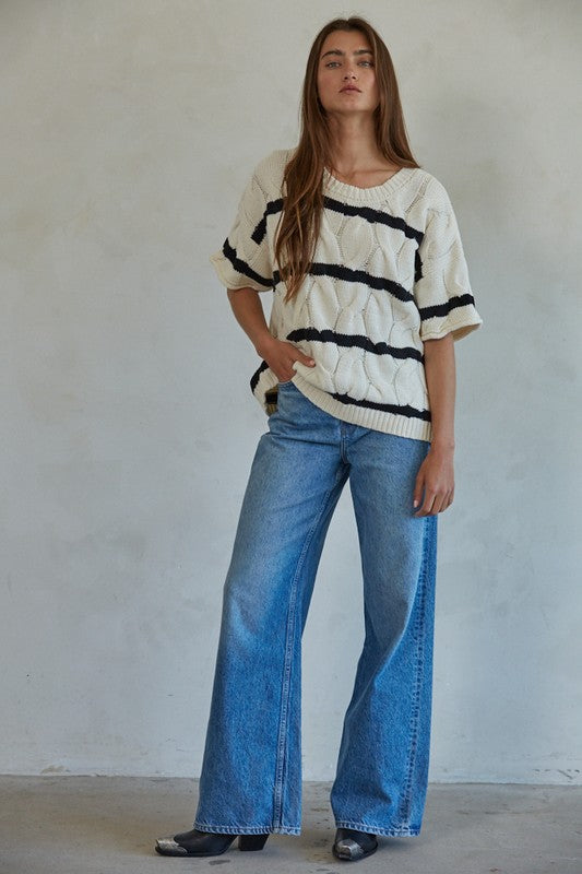 This cozy knit pullover sweater features a classic round neckline and charming short sleeves, making it the perfect transitional piece. Designed with soft, comfortable knit fabric, it’s accented with bold stripes that add a fresh, modern touch. Lightweight yet polished, this short-sleeve sweater pairs effortlessly with denim, skirts, or layered under jackets — an everyday staple with easy style.
