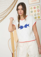 This short sleeve sweater adds a whimsical touch to everyday style with a charming fish motif. Crafted from a soft, lightweight knit, it offers comfortable wear with a polished finish. The short sleeves make it perfect for transitional seasons, while the relaxed yet flattering fit makes it easy to style with denim, skirts, or tailored pants. Whether worn casually or dressed up with accessories, this sweater brings personality and effortless charm to any outfit.