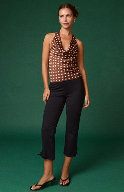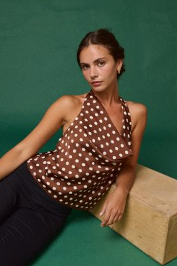 Turn heads in this polka dot halter top, where classic charm meets confidence. This flirty, flattering piece features a soft draping cowl neckline that adds a touch of sophistication, while the halter tie accentuates your shoulders for that effortless look. The warm brown base and playful white polka dots create a timeless yet fun look — Lightweight and breathable, this top is made to keep you cool and confident