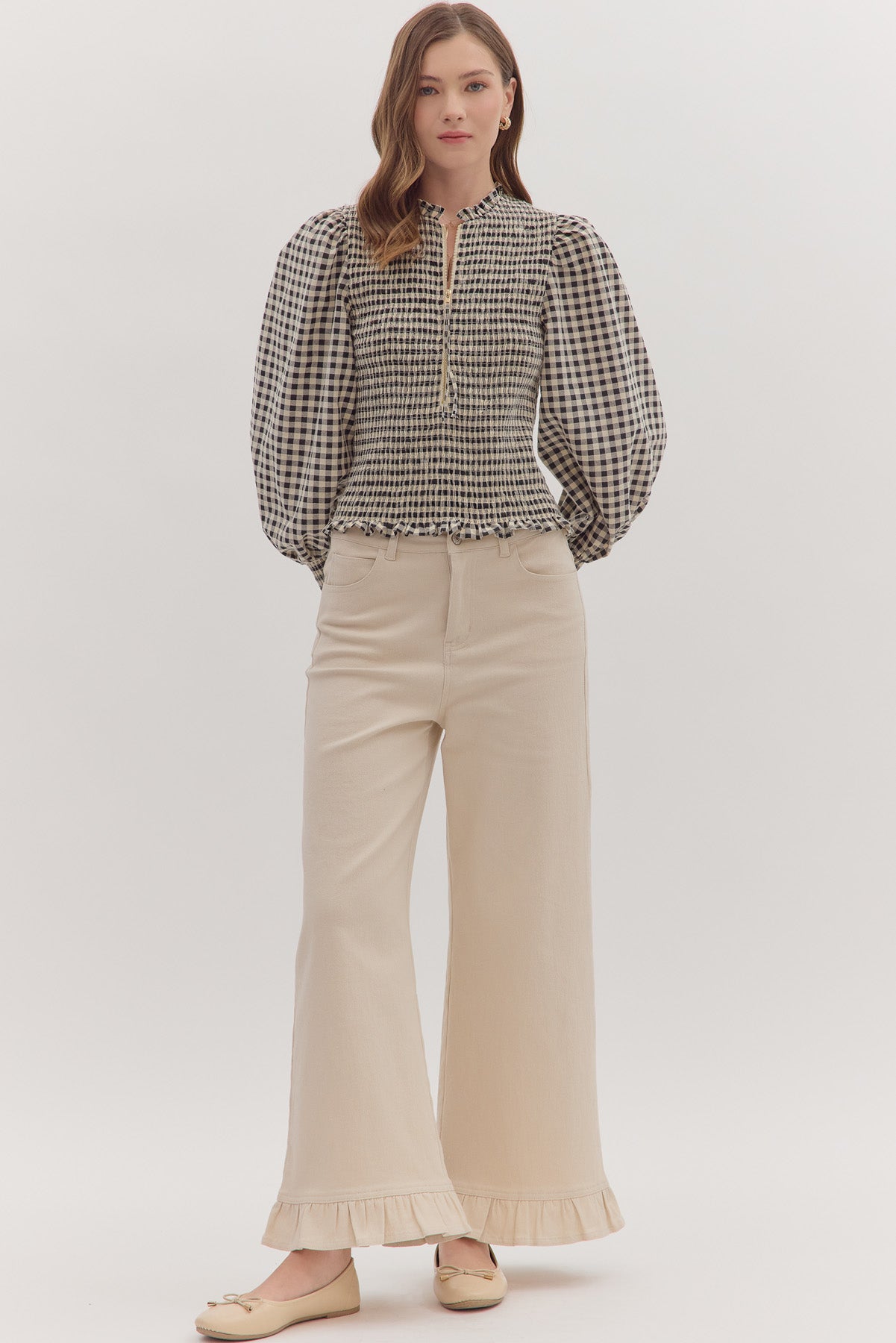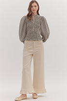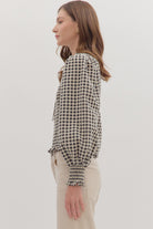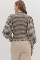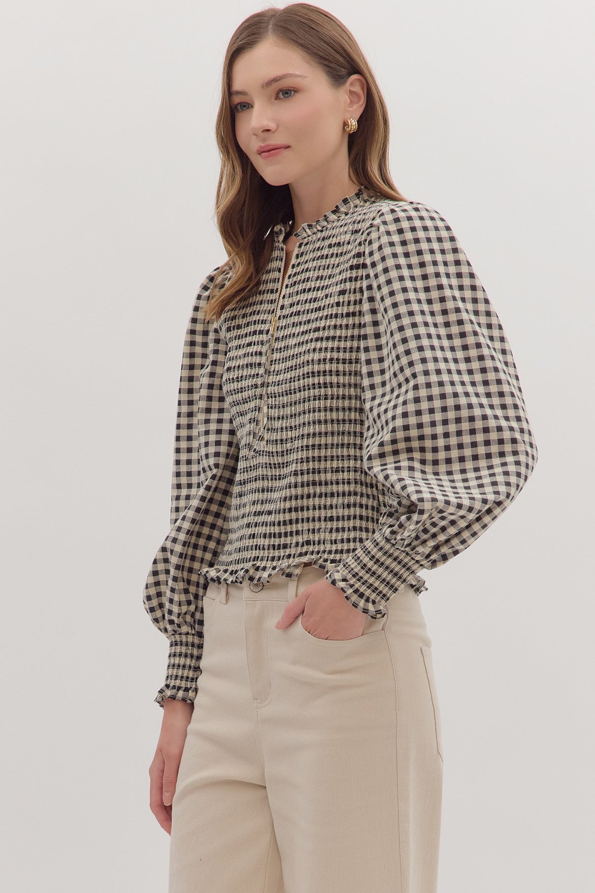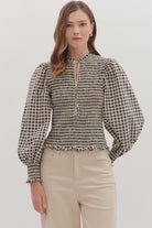 Sweet with a hint of sass — this gingham long puff sleeve top features a smocked bodice that flatters your figure and a flirty ruffle hem for that perfect feminine finish. The zip-front closure adds a modern edge, while the lightweight woven fabric keeps it airy and comfortable. Unlined and non-sheer, it’s a must-have statement piece for any season.