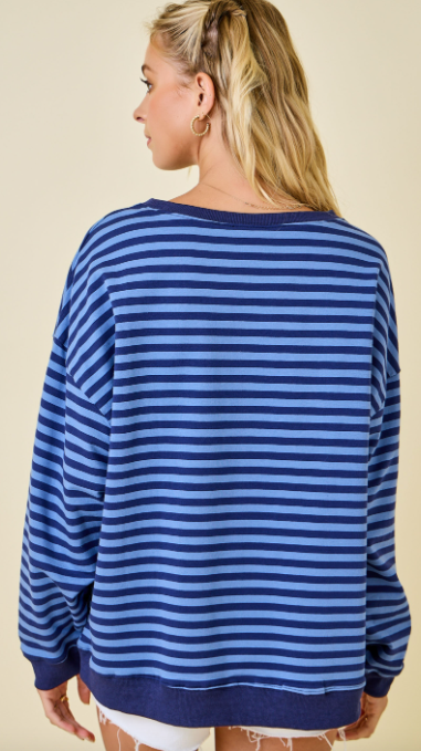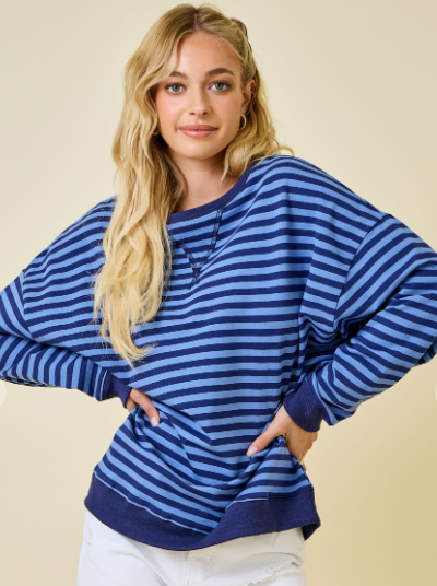 Relaxed and effortlessly stylish, this Oversized Stripe Knit Top with Contrasting Rib is a must-have for everyday wear. Designed with a loose, comfortable fit, it features a classic striped pattern elevated by contrasting ribbed trim for a modern, eye-catching finish. The soft knit fabric drapes beautifully, making it perfect for layering or wearing on its own. Easy to dress up or down, this top pairs seamlessly with denim, shorts, or lounge bottoms for a polished yet laid-back look.