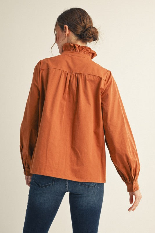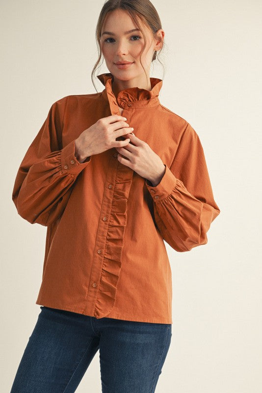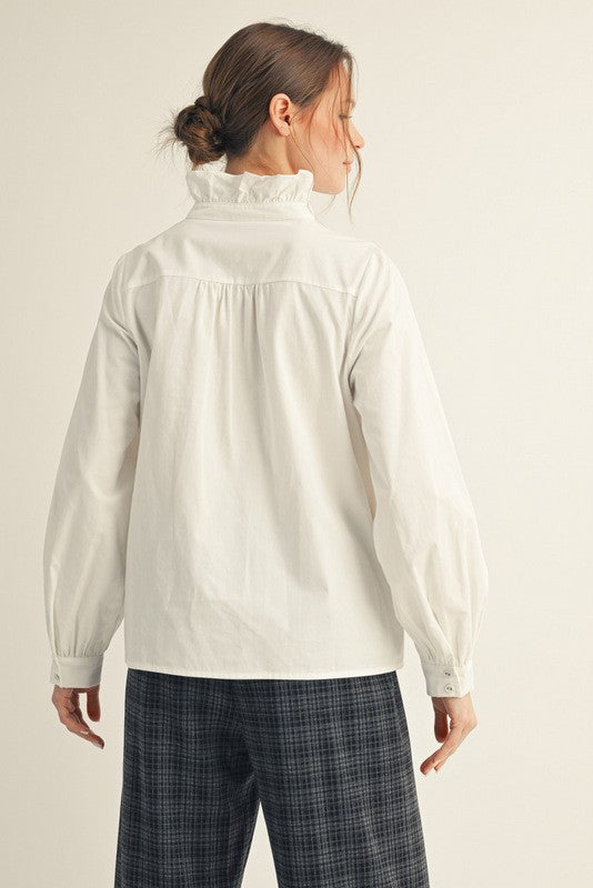 Classic meets feminine in this crisp white button-down, elevated with a mock-ruffled collar and a cascading ruffle detail that trails down the front. The tailored fit gives it a polished edge, while the ruffles add just the right amount of romantic charm. Perfect to style with denim for a chic daytime look or tucked into a sleek skirt for an elegant evening vibe.