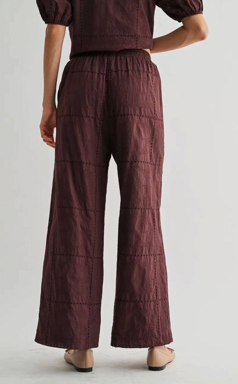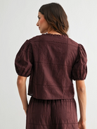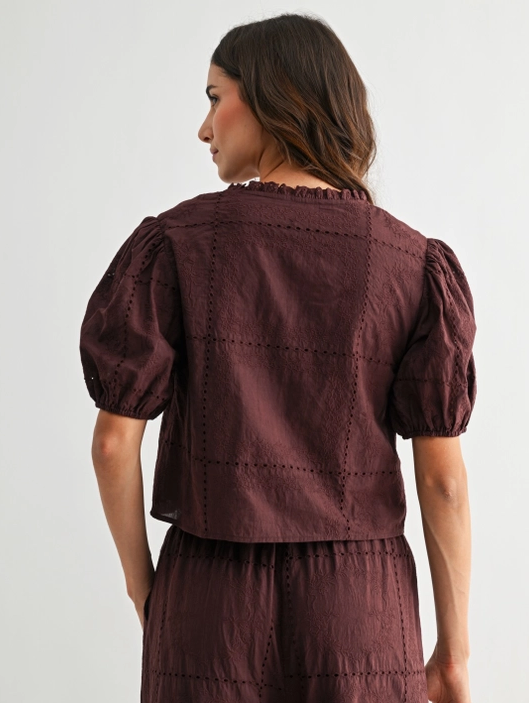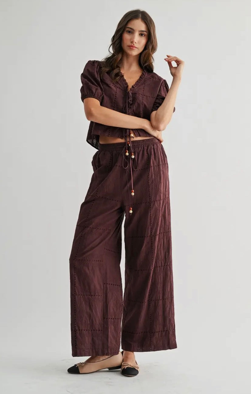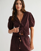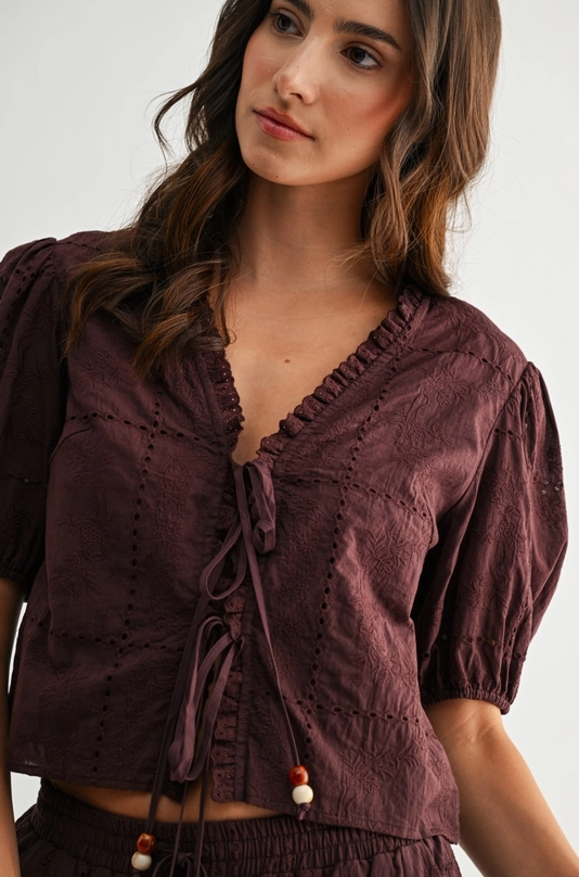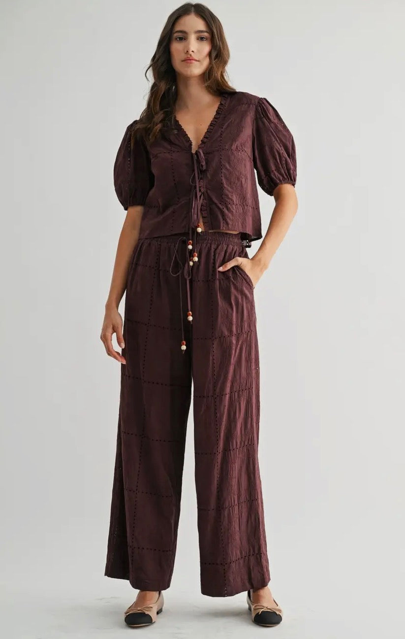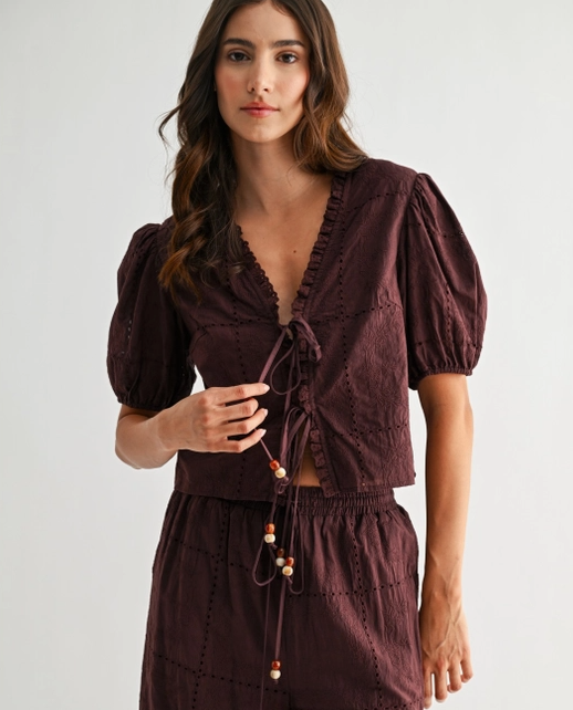 Elevate your wardrobe with this rich brown boho set, designed with the perfect blend of femininity and laid-back charm. The blouse features soft puff sleeves with elastic cuffs, a subtle textured pattern throughout, and a flattering V-neckline framed by delicate ruffled trim. A double tie-front closure adds a unique touch, adorned with wooden and colorful bead accents for an earthy, handcrafted feel.