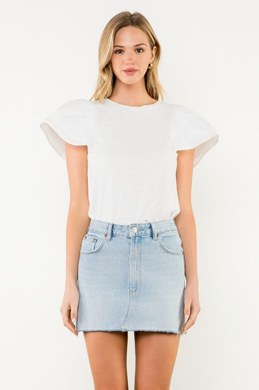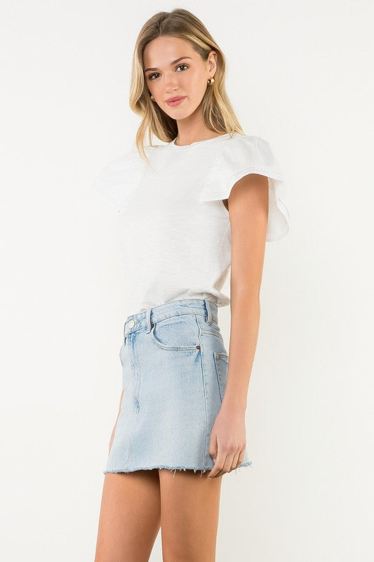 This ruffle-layered, flutter-sleeved top in crisp white takes a wardrobe staple and gives it a chic, elevated twist. The cascading ruffle layers add graceful movement, while the flutter sleeves bring a touch of femininity and charm. Crafted from lightweight fabric, it’s breezy yet polished, making it perfect for both casual days and dressier moments.
