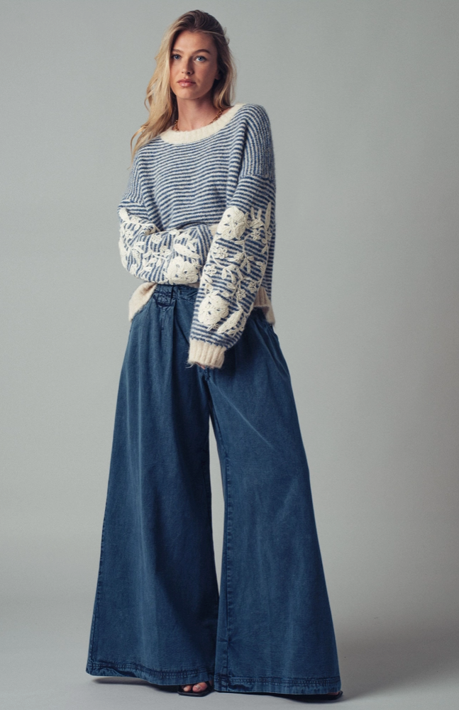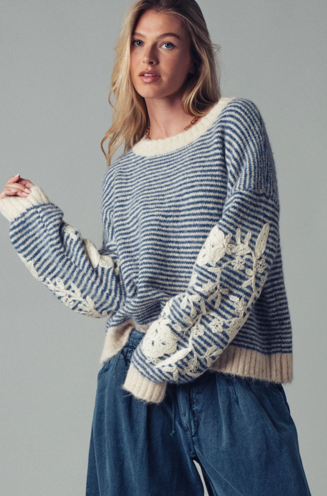 This cozy striped sweater top adds charm with delicate floral embroidery on the sleeves. Made from a soft recycled knit blend, it's perfect for pairing with denim skirts, trousers, or layered over dresses for a casual yet elevated look.