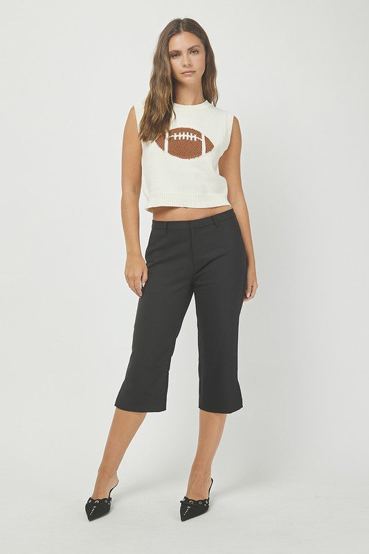 This football sweater tank, with rhinestones embedded in the football design, is the perfect addition to any game day outfit. Its ribbed bottom and cropped armholes provide a stylish look while supporting your team. Stand out from the crowd with this unique and eye-catching tank.