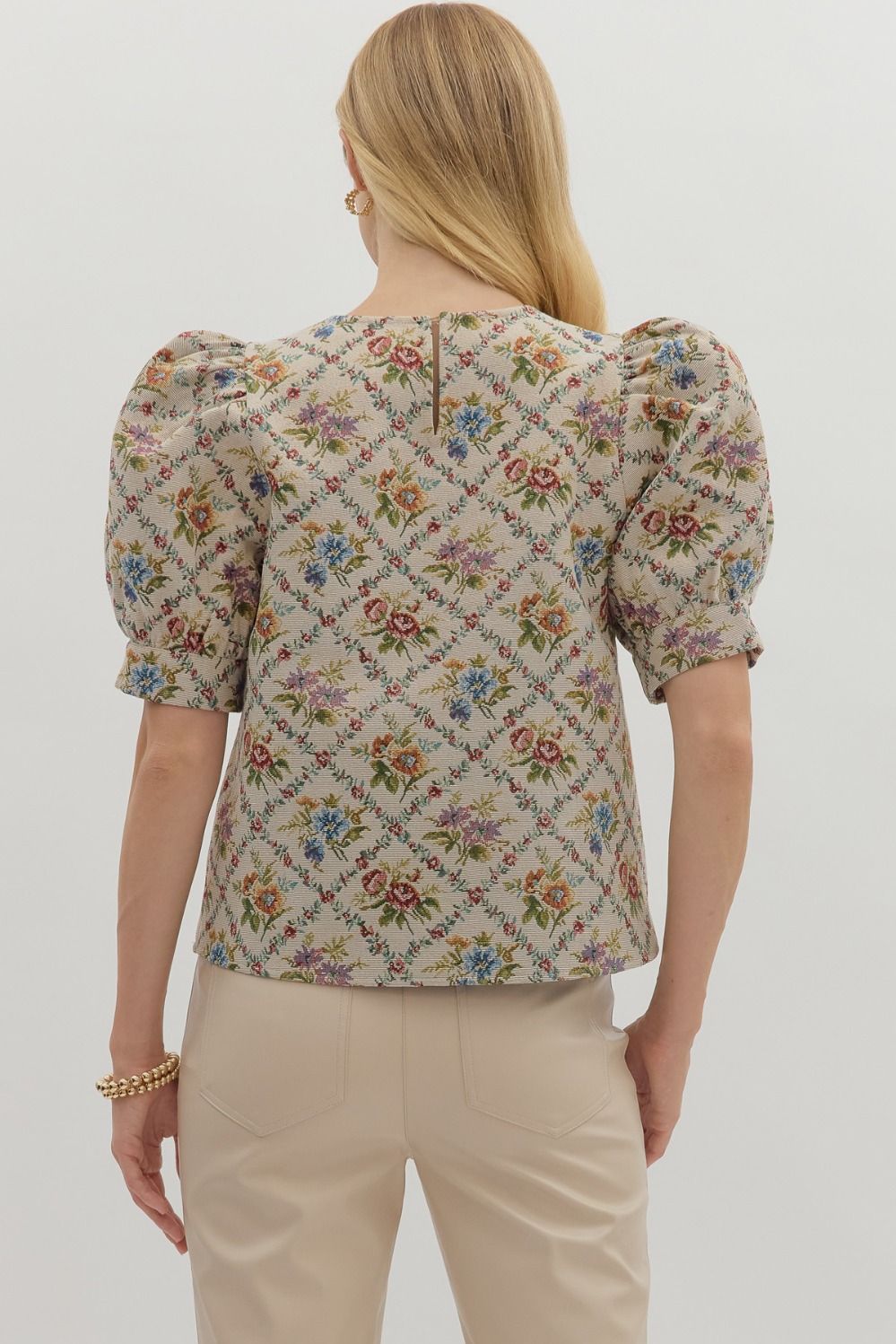 Make a statement with this stunning botanical jacquard top, designed with timeless elegance in mind. The intricate woven pattern adds texture and depth, while the structured puff sleeve brings a modern, feminine touch. Featuring a classic round neckline and a delicate button closure at the back, this top offers effortless sophistication. Perfect for dressing up your workday or elevated evening look.