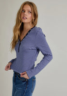 This long sleeve striped top is a timeless everyday staple with a modern twist. Designed with classic stripes and functional snap buttons down the front, it offers versatile styling—wear it fully snapped for a polished look or slightly open for a more relaxed vibe. The long sleeves add easy coverage, making it perfect for layering or wearing on its own.