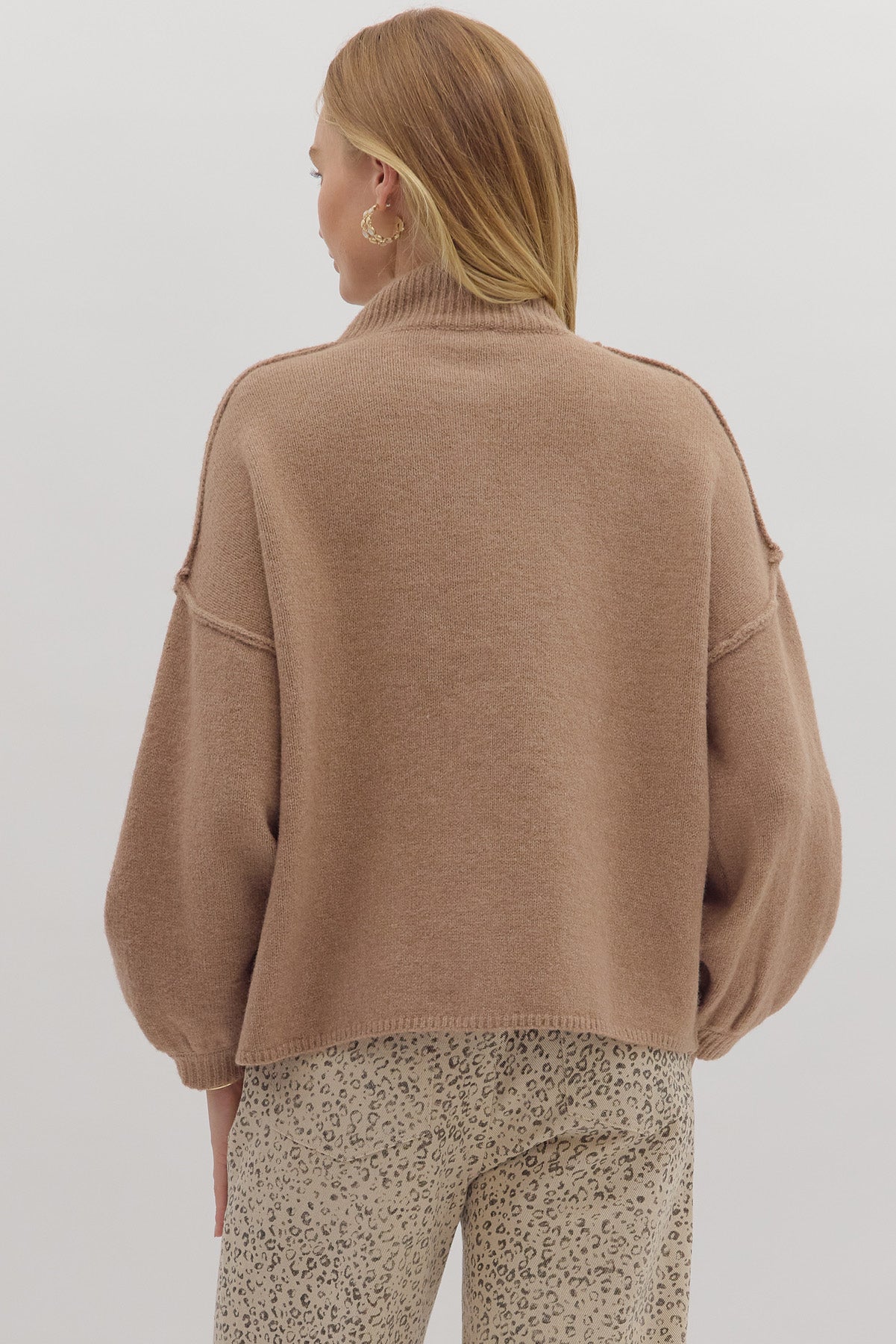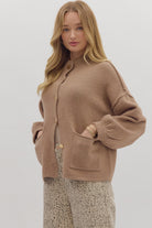 The Harvest Glow Cardigan — your cozy-chic essential for the seasons ahead. Solid taupe in color, this long sleeve knit features a sophisticated mock neck, hammered gold-tone button front closure, and handy front pockets. Its medium-weight design makes it perfect for layering as you transition from crisp fall mornings to chilly winter evenings.
