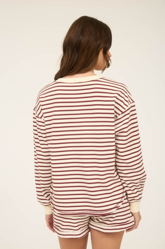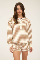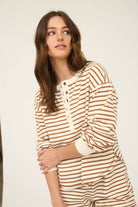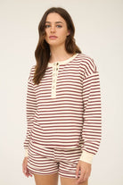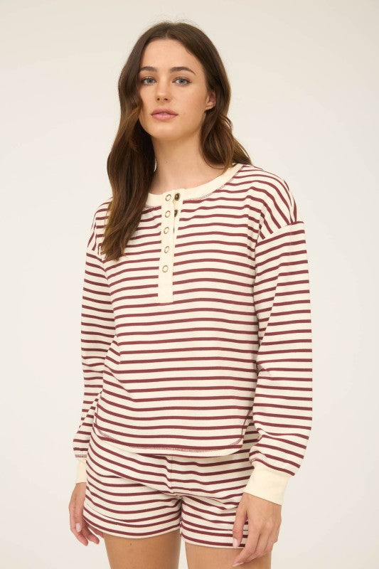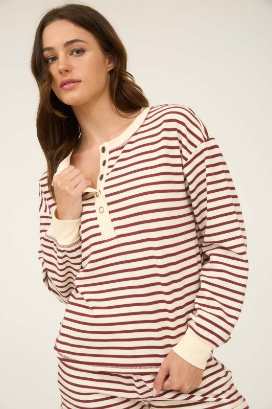 This stripe Henley knit top is the perfect mix of cozy and cool. Featuring snap buttons down the front and classic long sleeves, it comes in two warm fall-ready hues—rich burgundy and earthy brown. The soft knit fabric makes it an everyday essential, while the subtle stripe pattern adds just enough texture to keep things interesting.