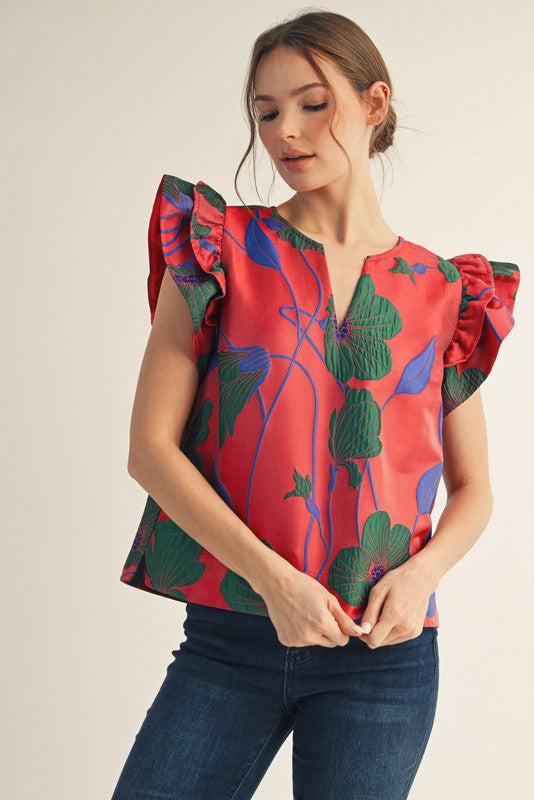 This red floral jacquard top is blooming with charm! Featuring an elegant textured floral pattern and flirty ruffle sleeves, it brings the perfect pop of romance to any look. The rich red hue and delicate flower details make it a standout piece—whether you’re pairing it with denim for day or dressing it up for date night. Bold, feminine, and effortlessly chic.
