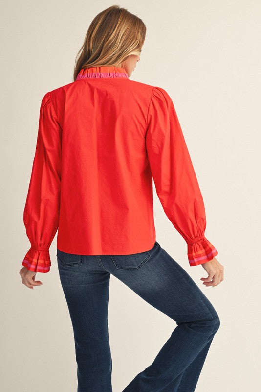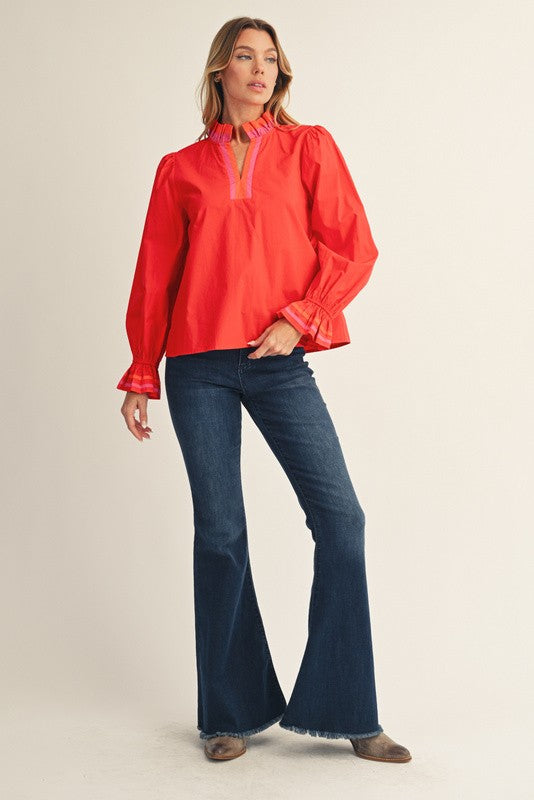 This color block accent top brings a bold pop of red with a modern twist. Featuring long sleeves and a striking mix of contrasting tones, it’s the perfect blend of classic and contemporary. The playful color block design adds just enough edge while still keeping it versatile for everyday wear.