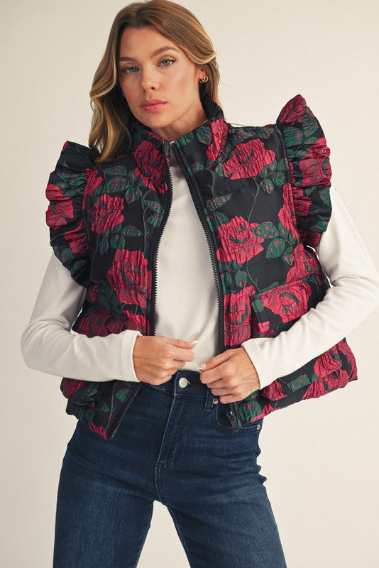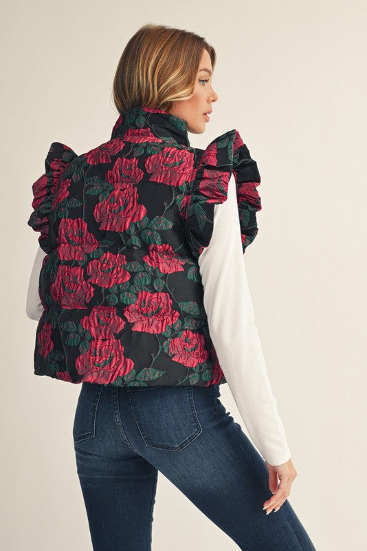 This black floral jacquard puffer vest is a chic twist on a cold-weather staple. The jacquard floral pattern adds a touch of elegance and texture, giving it a luxe, elevated feel while still keeping the warmth and comfort of a classic puffy vest. Its sleek silhouette layers beautifully over sweaters or long sleeves, making it a standout piece for both casual and dressier looks.