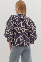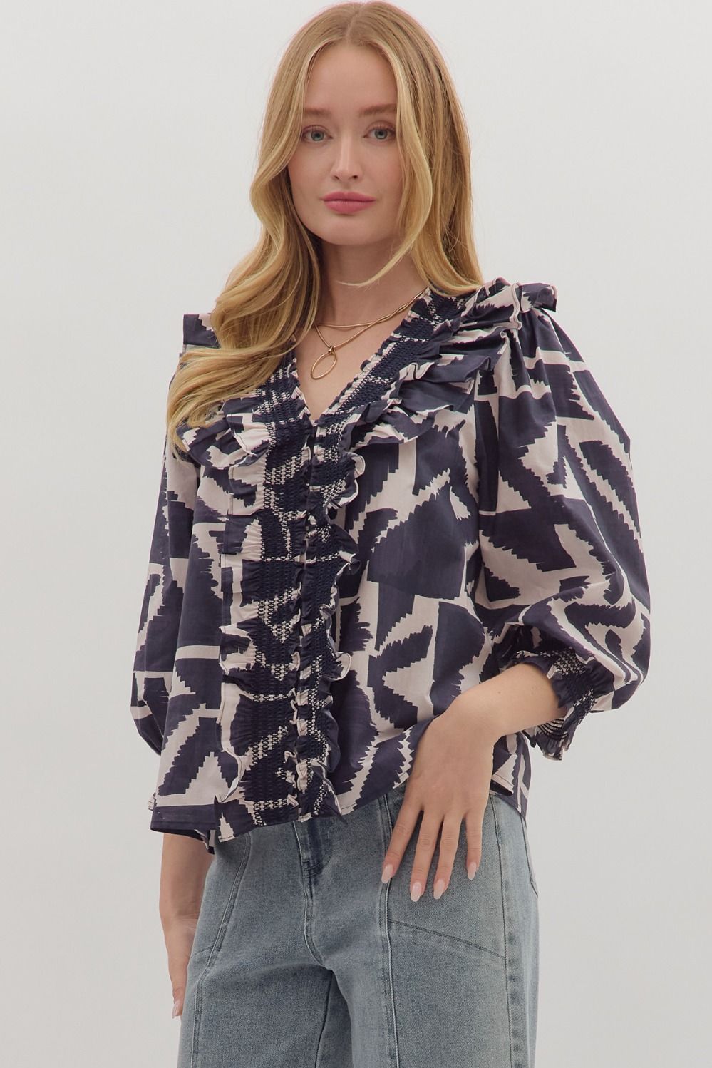 Flirty and feminine, this printed top is full of charming details. The 3/4 puff sleeves with smocked cuffs add playful volume, while the ruffle-trimmed V-neck brings a touch of romance. Lightweight and woven, it’s easy to wear and effortlessly chic — perfect for everything from brunch to date night.