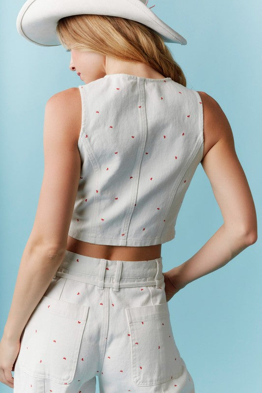 Add a pop of charm to your 4th of July look with this adorable white denim vest! Featuring a flattering classic fit and playful red mini bows printed all over, this piece is a perfect mix of cute and patriotic. Whether you’re layering it over a tank or pairing it with cutoffs, the all-American vibes and sweet details make it a summer standout. Think fireworks, picnics, and festive flair—all wrapped up in one must-have vest!