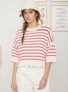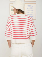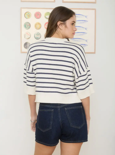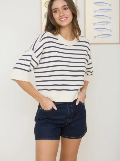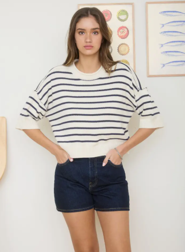 This striped short sleeve sweater features raw edge detailing and a relaxed drop-shoulder silhouette for an effortlessly cool, lived-in look. Crafted from a soft knit, it offers lightweight comfort while maintaining a modern, casual feel. The stripe pattern adds timeless appeal, while the raw edges bring subtle texture and edge. Easy to style and perfect for everyday wear, this sweater pairs seamlessly with denim, shorts, or layered looks.