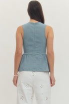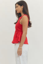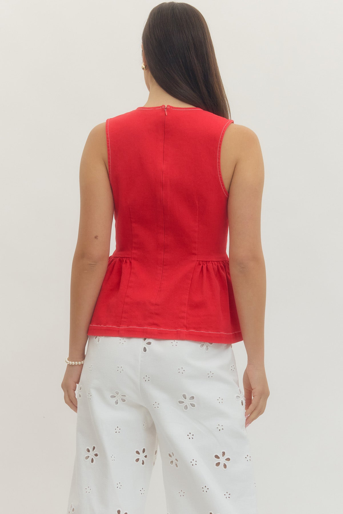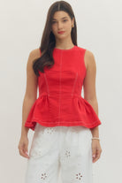 This chic sleeveless top features a flattering peplum silhouette that cinches at the waist and flares gently for an elegant, feminine shape. Designed with a classic round neckline and structured paneling, it’s finished with subtle contrast stitching that adds a modern, tailored touch. Easy to dress up or down, this top pairs beautifully with trousers, skirts, or denim for effortless day-to-night style.