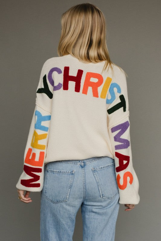 Cozy up in holiday style with this ivory knit sweater that’s anything but ordinary. Featuring long sleeves and a relaxed fit, it’s the perfect winter layer. Across the back, bold lettering spells out “Merry Christmas” starting on one arm, stretching across the shoulders, and finishing down the other sleeve—a festive statement that turns heads from every angle. Soft, warm, and full of cheer, this sweater is the ultimate mix of cozy comfort and holiday spirit.