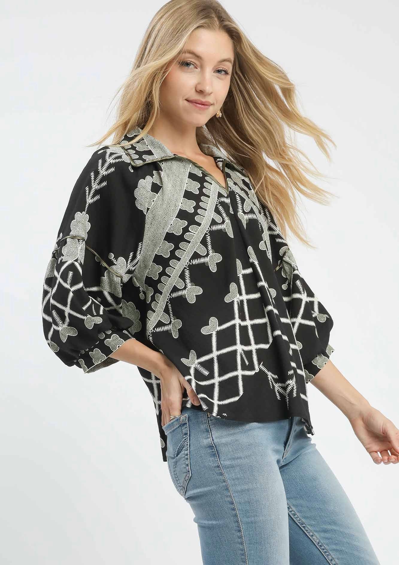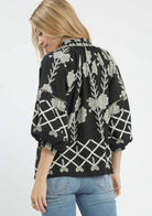 Effortlessly chic and versatile, this black blousy top features a striking white design that adds modern contrast and effortless style. The relaxed silhouette and lightweight fabric create a flattering drape that moves beautifully with every step. The three-quarter sleeves offer a perfect balance between coverage and breezy comfort — ideal for transitioning from day to night.