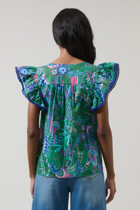 This green poplin top is fresh, fun, and full of detail. Designed sleeveless for an easy, breezy fit, it features playful ruffles along the sleeves that add the perfect feminine touch. The crisp poplin fabric keeps it structured yet comfortable, making it a versatile piece to dress up or down all season long.