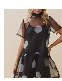 This sheer black dress brings effortless elegance with a playful twist. Designed with a high neckline and self-tie detail, it features short sleeves and a softly tiered hem that creates beautiful movement. The relaxed silhouette keeps it easy and flattering.