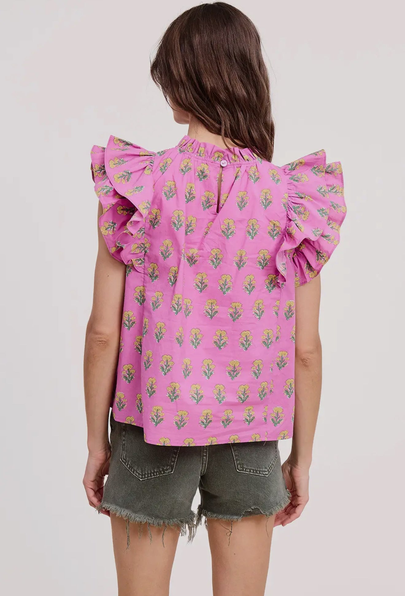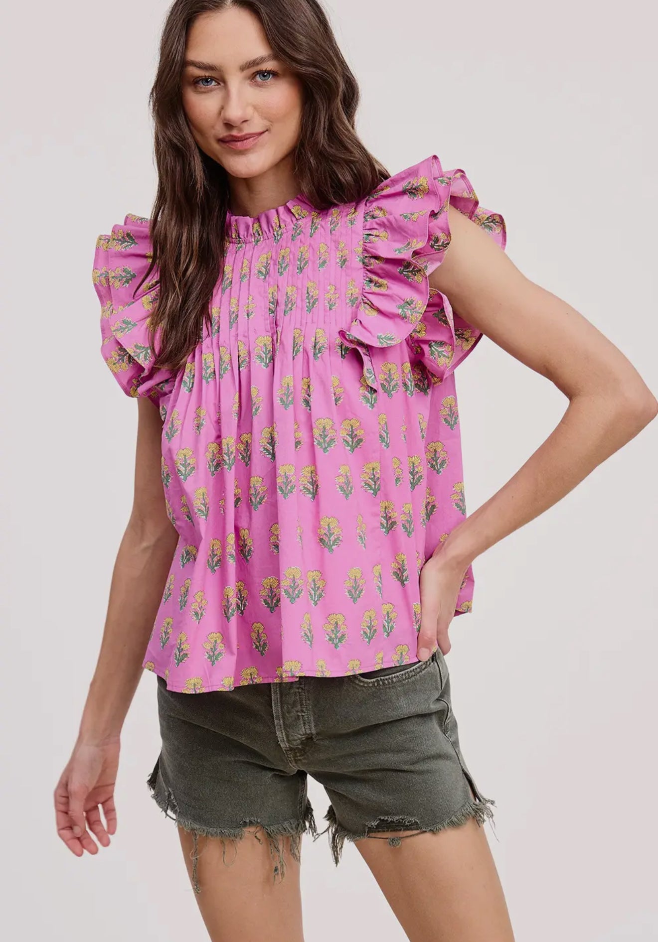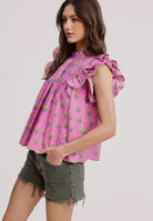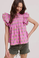 This breezy top features delicate pleats and soft flutter sleeves that create a graceful, airy silhouette with beautiful movement. Designed with a refined high neckline, it adds an elegant touch while remaining easy and wearable. Lightweight and flattering, this top transitions effortlessly from casual daytime looks to more dressed-up moments with the right accessories.