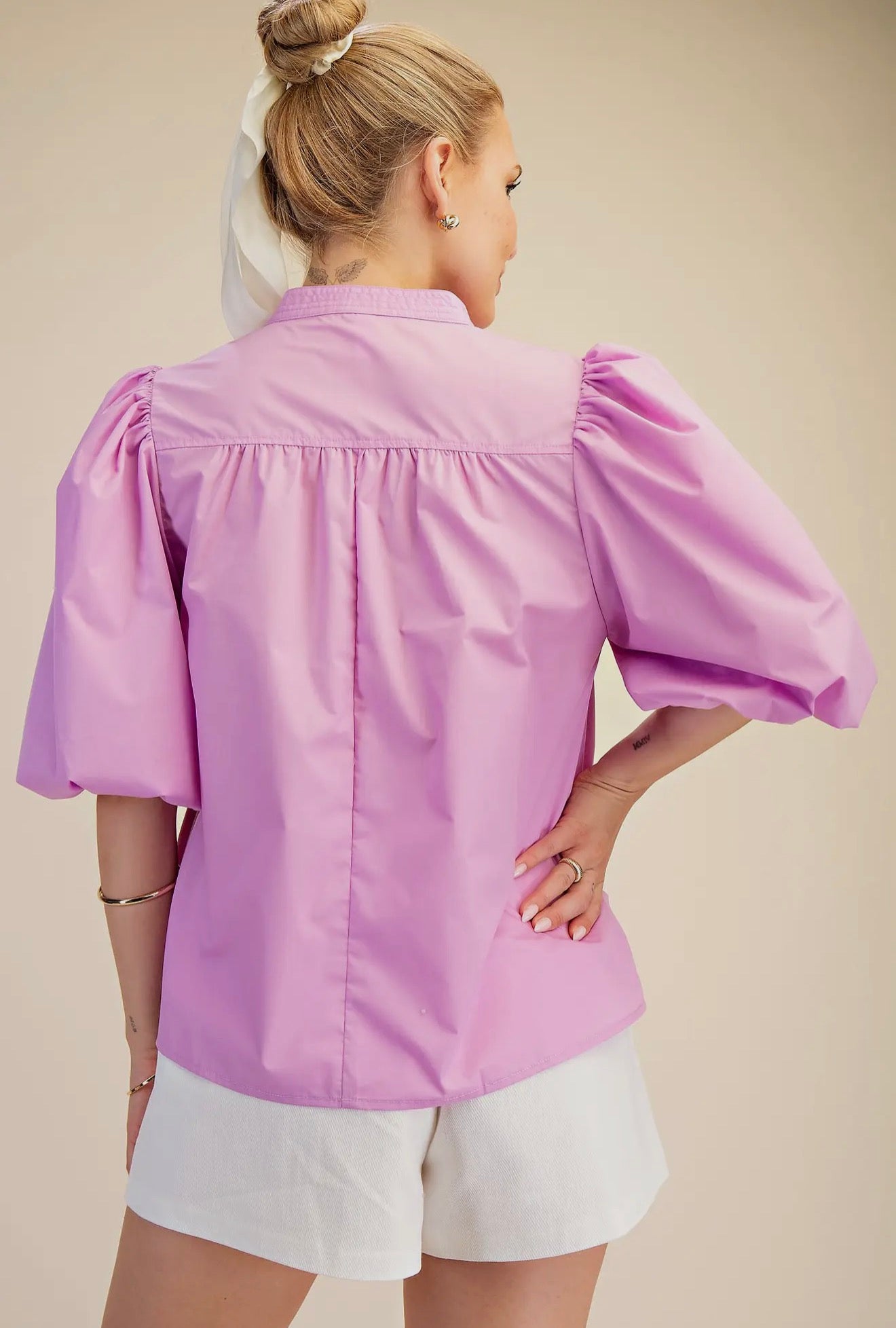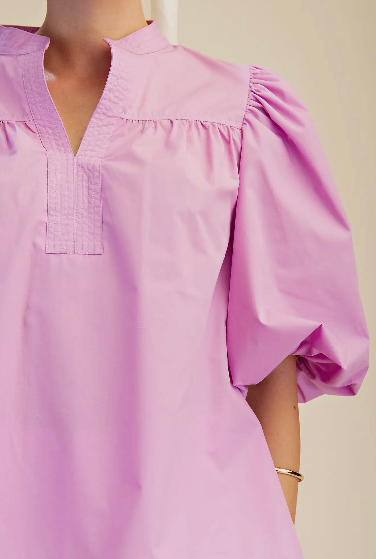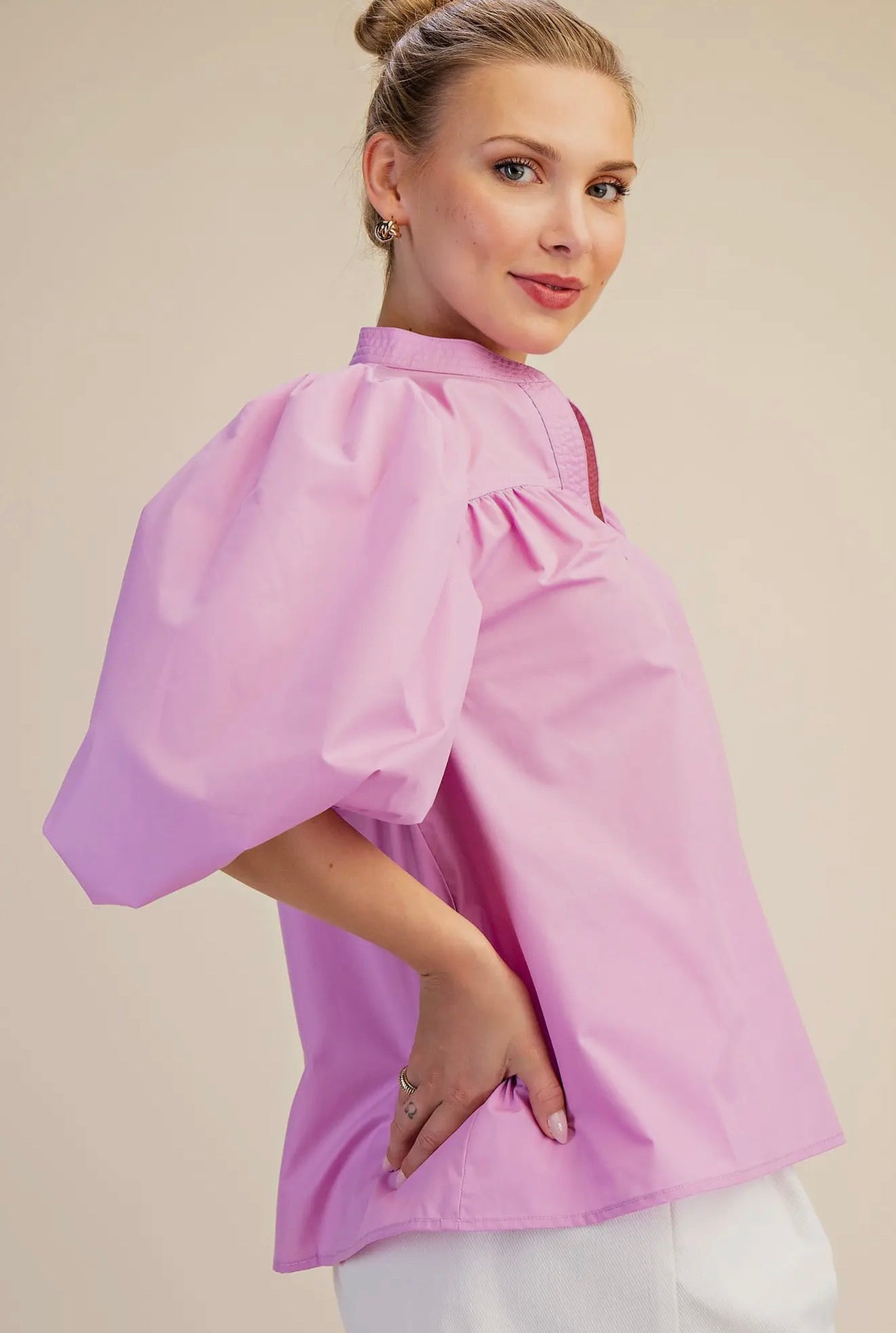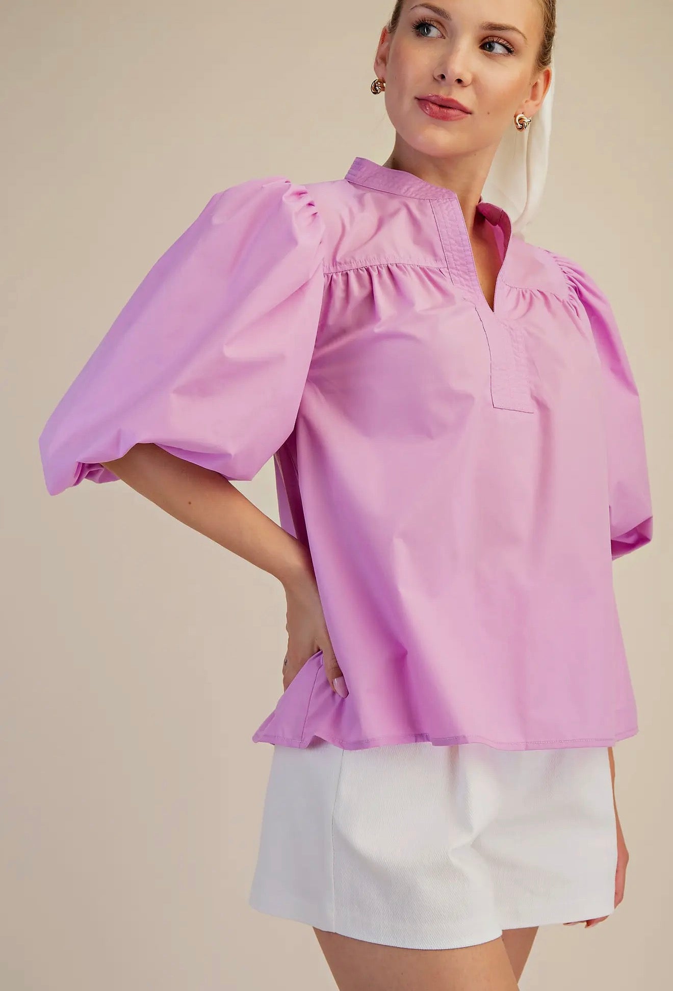 This collared V-neck poplin top brings the perfect mix of polished and playful. Made from crisp, lightweight poplin, it features statement bubble sleeves that add just the right amount of volume while keeping the fit flattering and easy. The bubble gum pink hue is bright, cheerful, and impossible not to love—perfect for adding a pop of color to your everyday wardrobe.