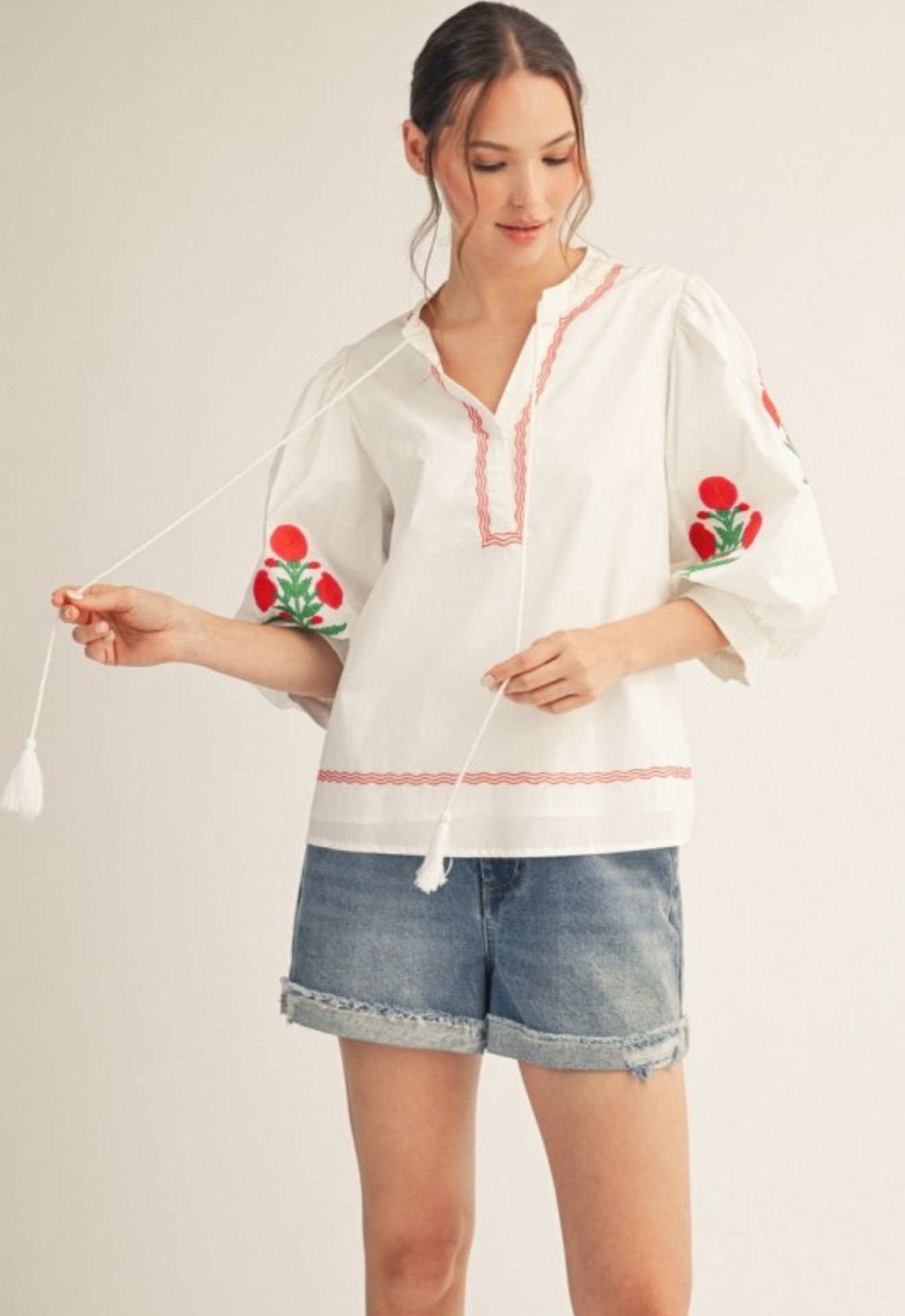 This embroidered peasant top brings a fresh, boho-inspired feel to an everyday classic. Crafted in crisp white, it features vibrant red embroidery accented with complementary hues for a beautifully detailed finish. The relaxed peasant silhouette offers an easy, flattering drape, making it perfect for pairing with denim, shorts, or layered looks all season long.