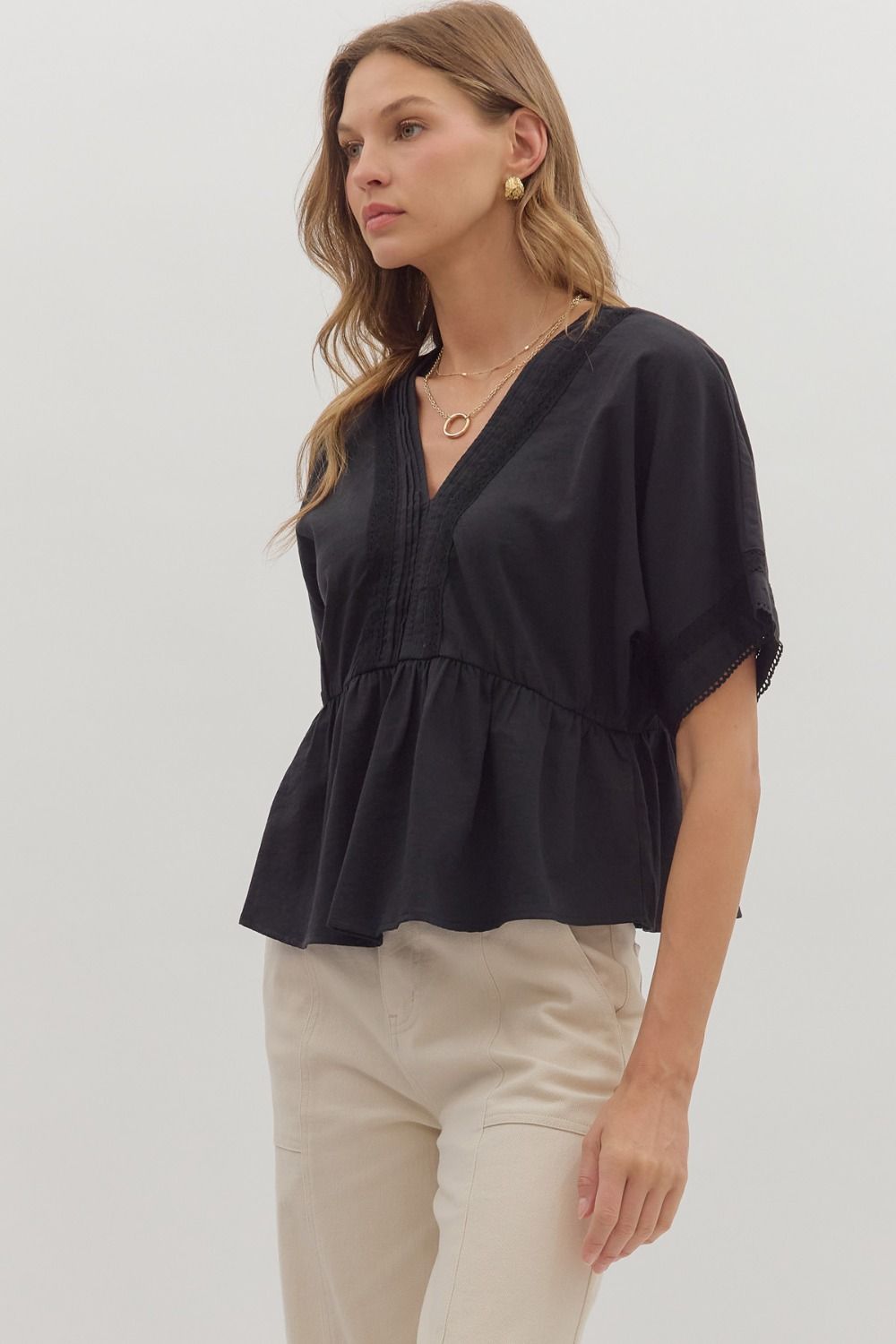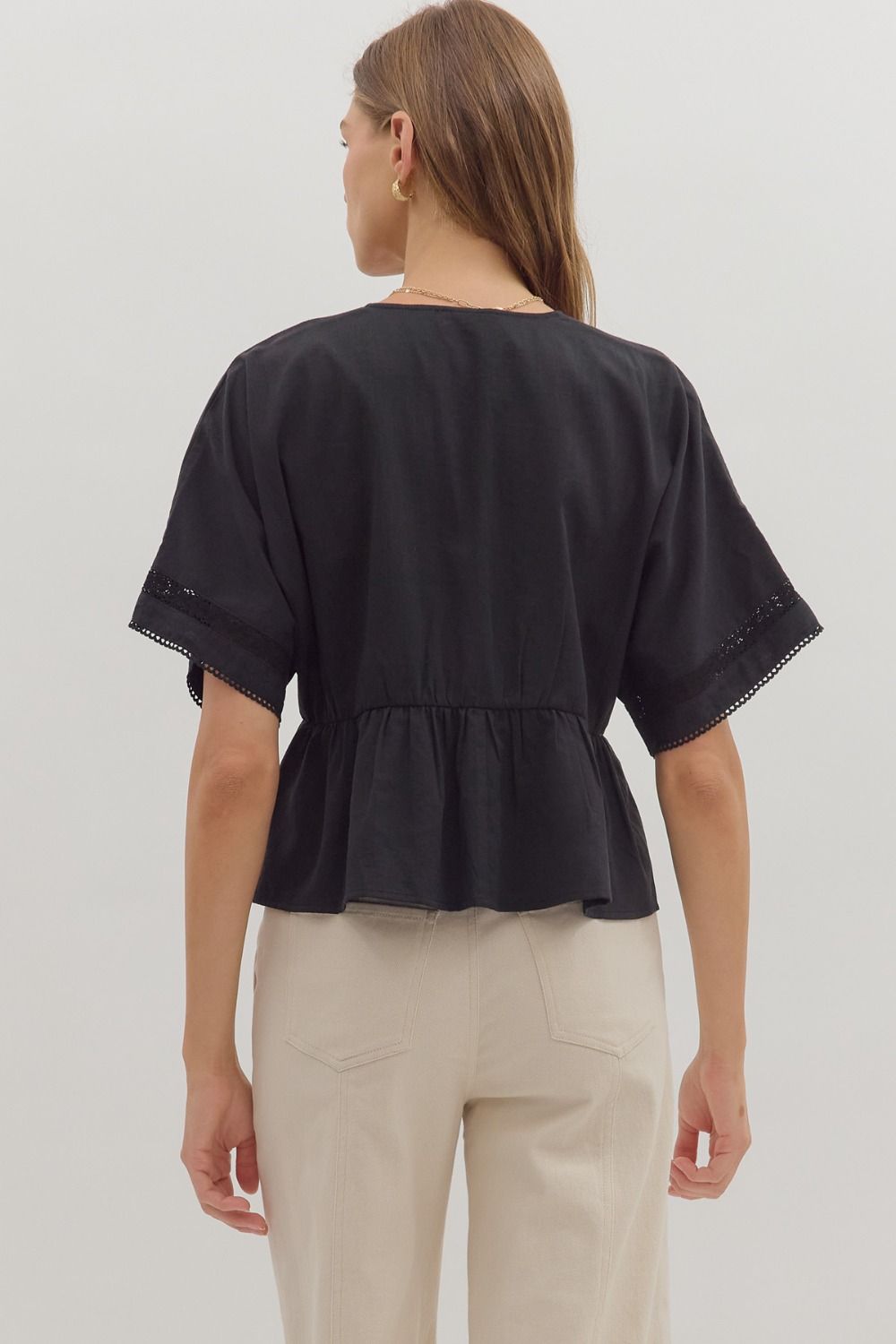 A sweet and feminine staple, this solid short sleeve peplum top is the perfect blend of delicate detail and everyday ease. Featuring pintuck accents and lace trim detailing, it adds just the right touch of texture and charm. The flattering peplum silhouette creates soft shape, making it an effortless piece to dress up or down. Crafted in a lightweight, woven fabric that’s non-sheer and unlined, it keeps you cool, comfortable, and polished all day long.