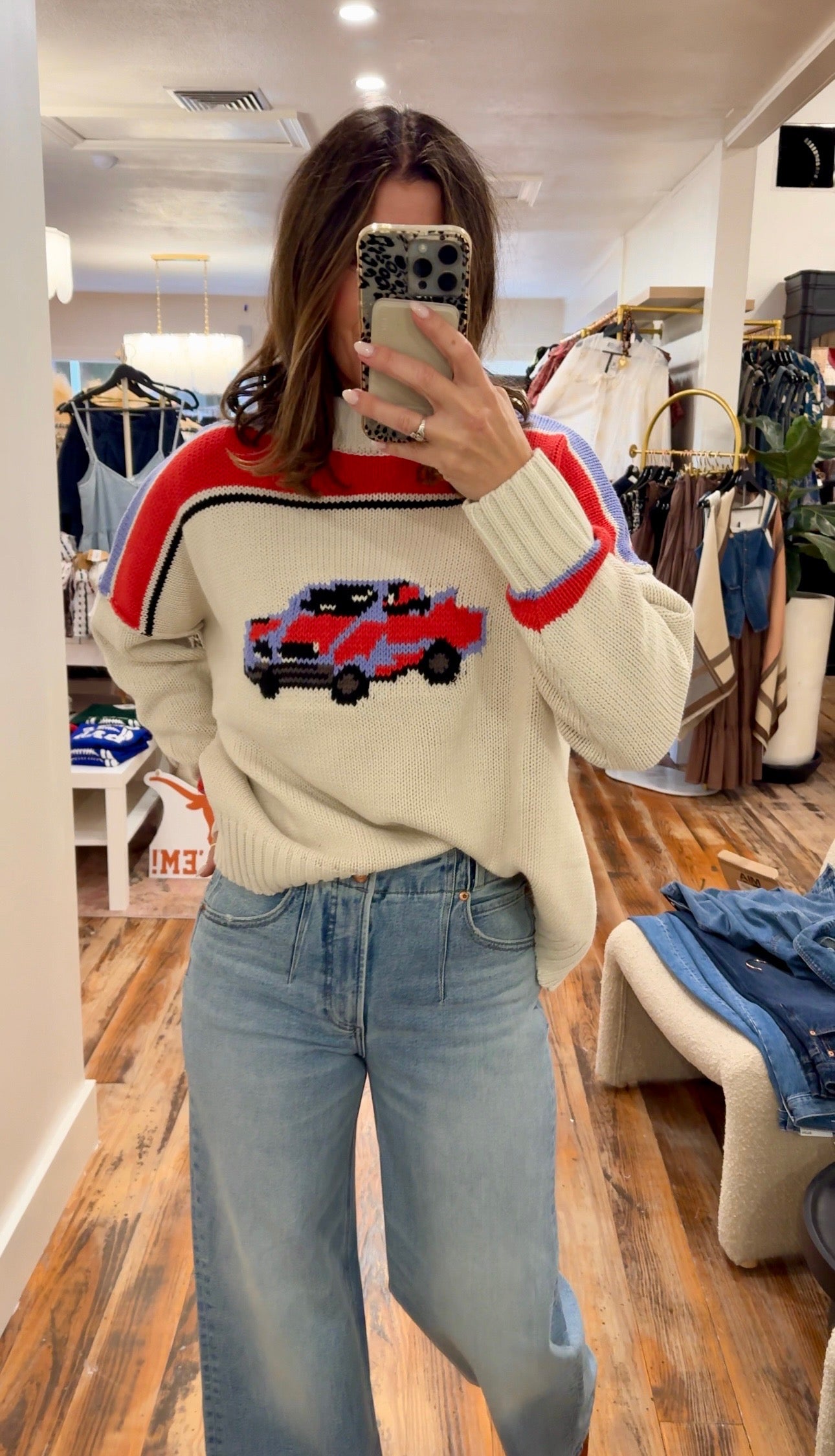 Bring on the nostalgia with this playful retro car crew neck sweater—an oversized pullover with serious vintage vibes. Featuring a bold, colorful car graphic across the front, it’s the perfect piece to add personality to your cool-weather wardrobe. Cozy and eye-catching, this sweater makes a statement on its own, so style it with classic denim, leather leggings, or a mini skirt and boots for a fun, throwback-inspired look. It’s intentionally oversized—size down for a more relaxed, but not too slouchy, fit.