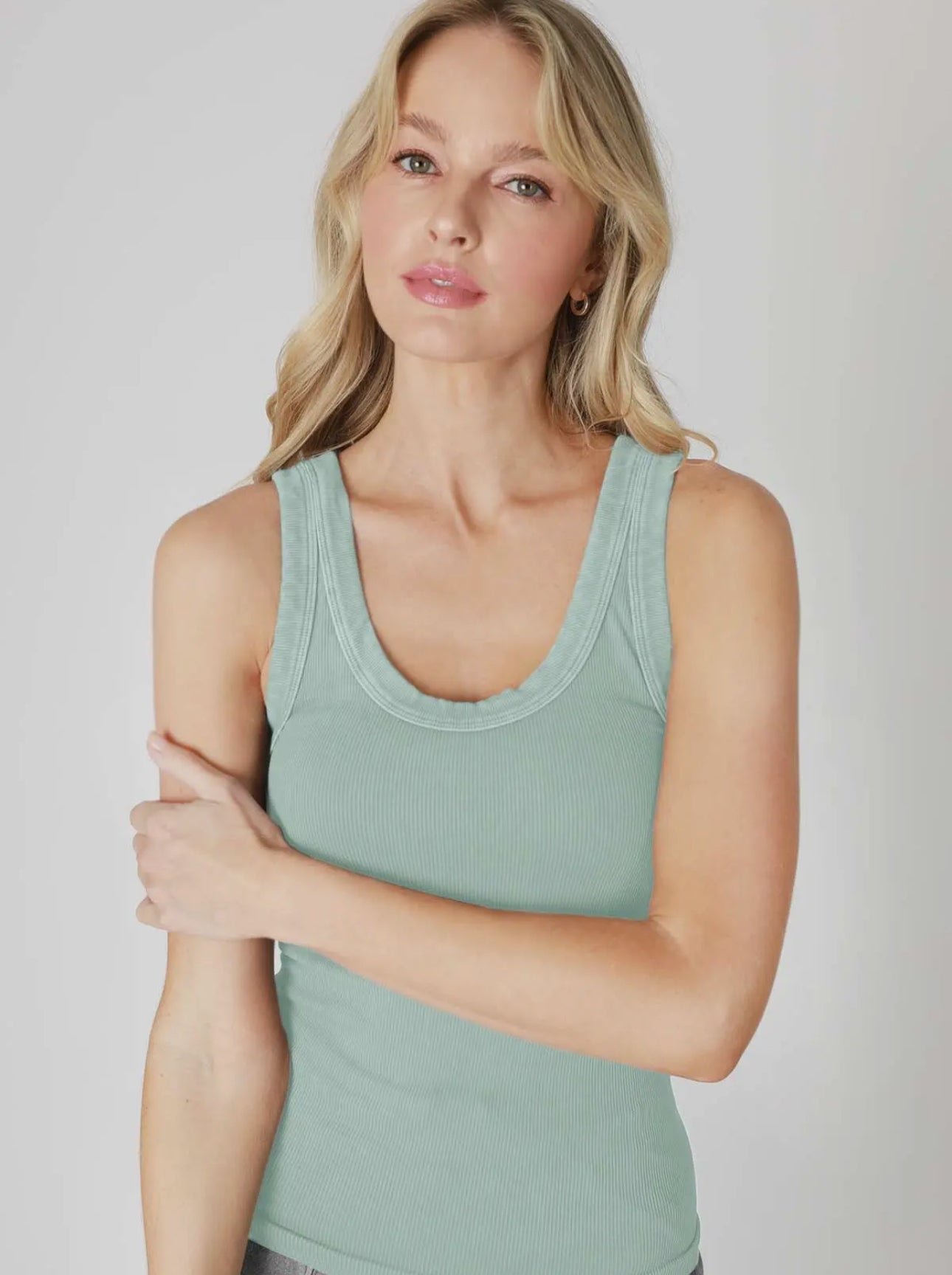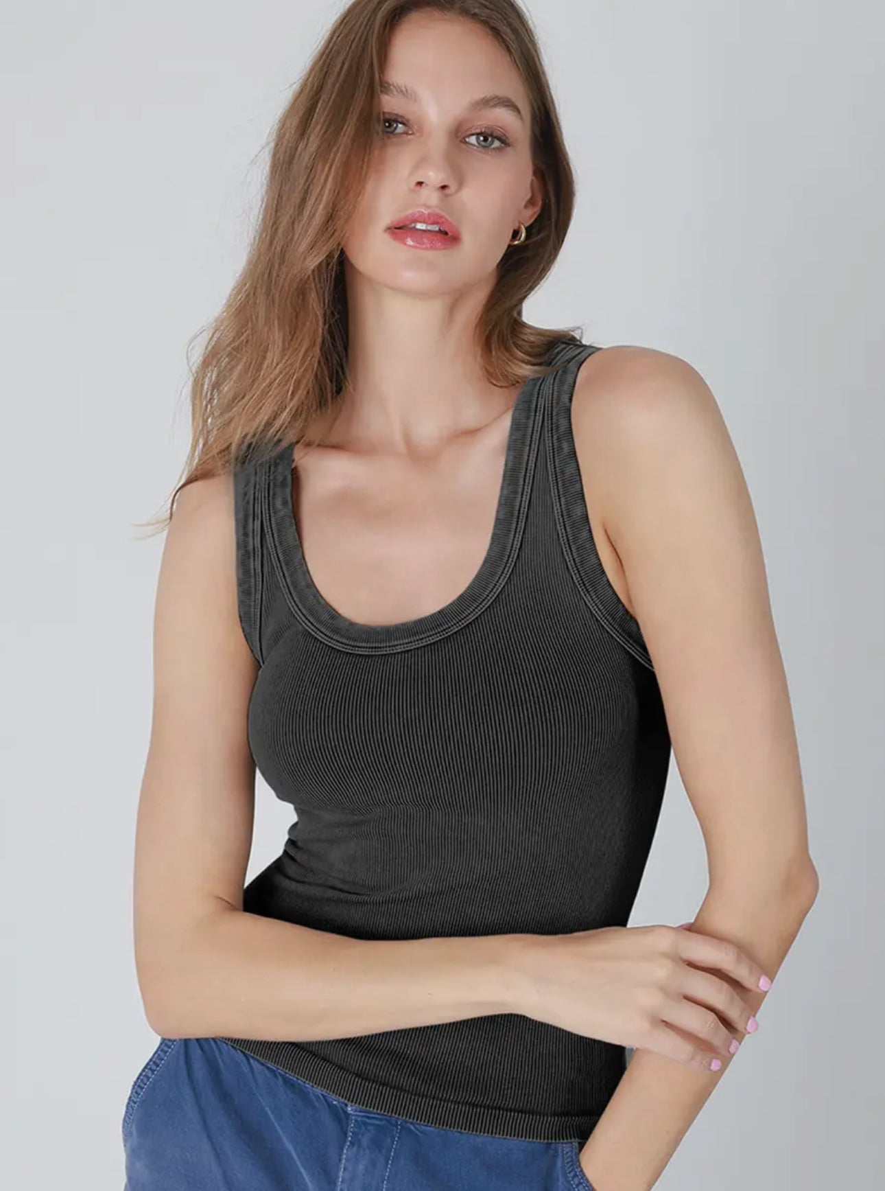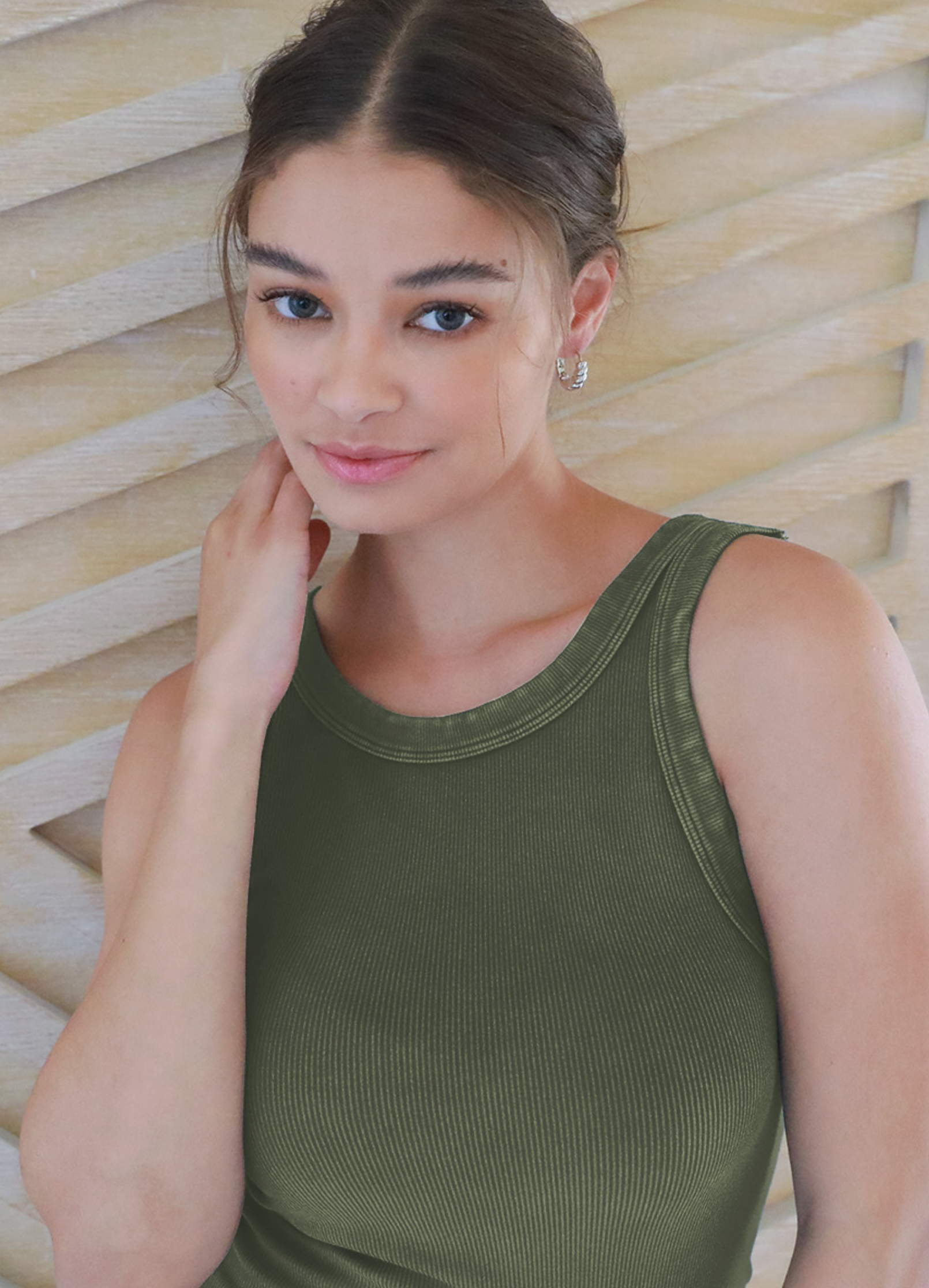 A reversible ribbed knit tank top that can be worn as a scoop neck