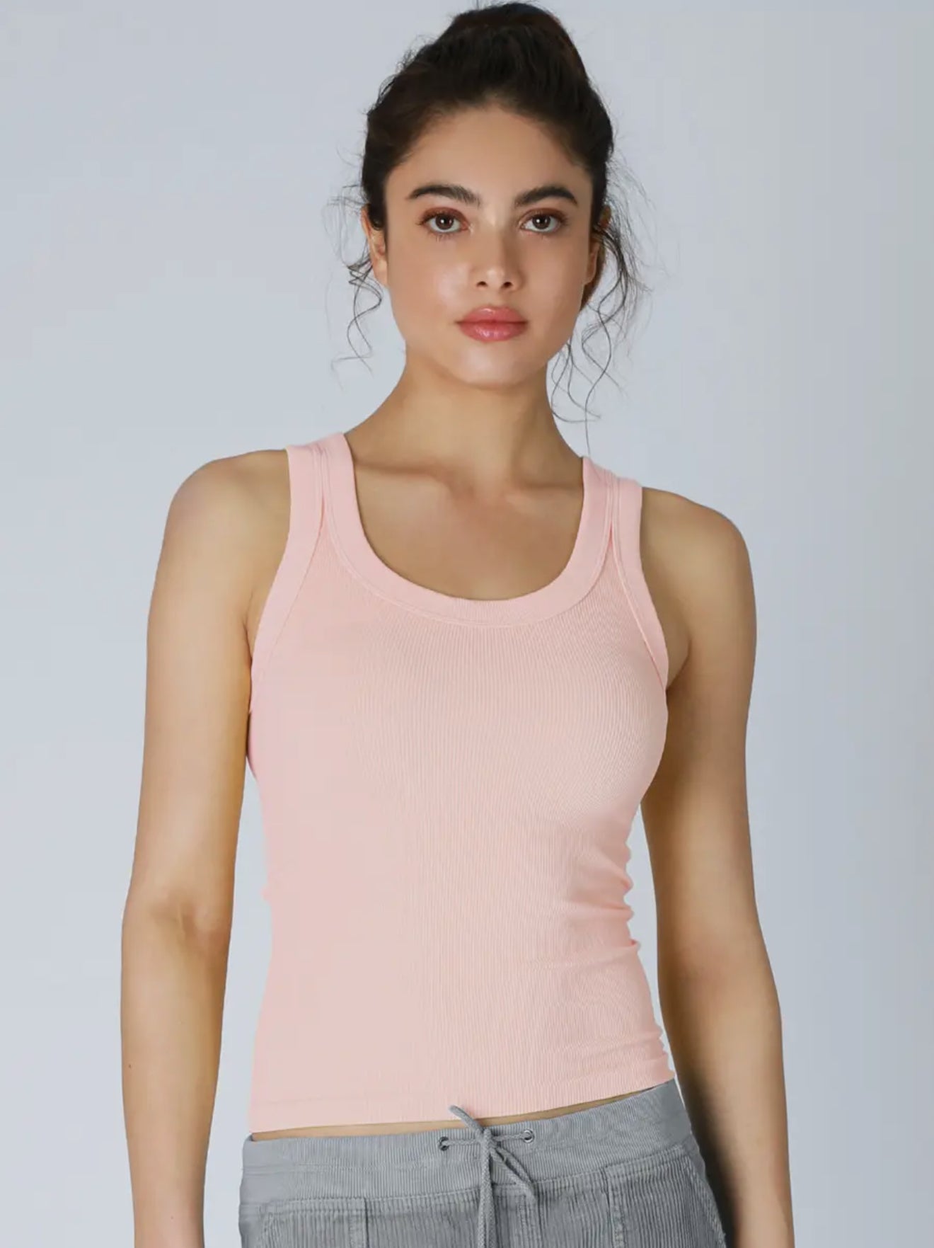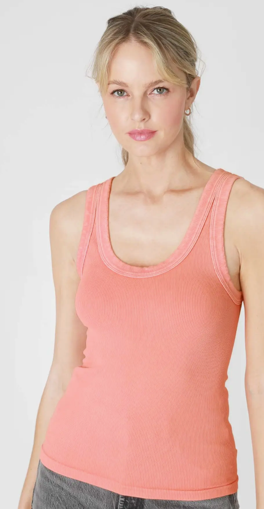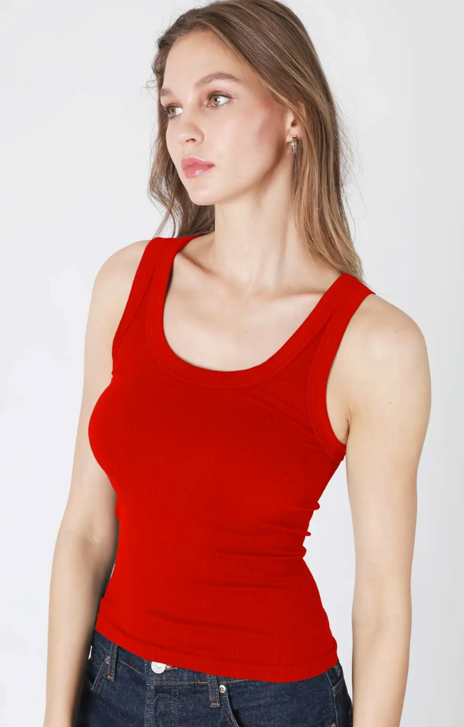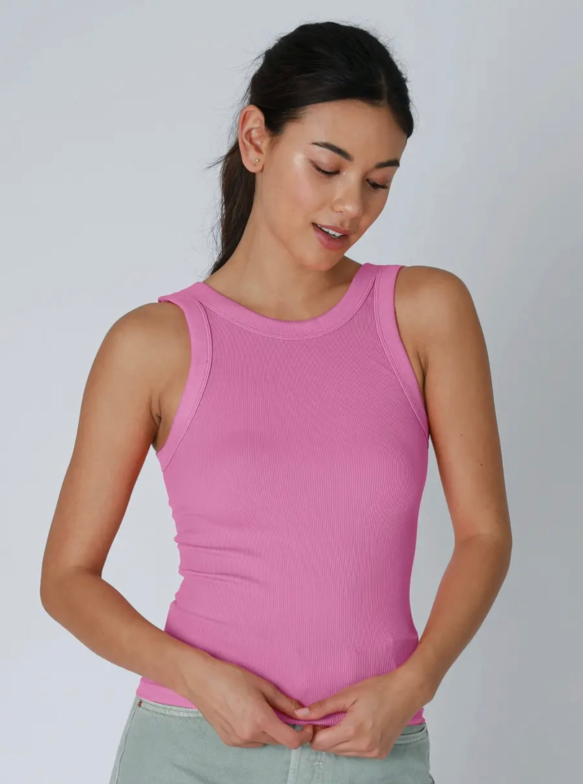 A reversible ribbed knit tank top that can be worn as a scoop neck